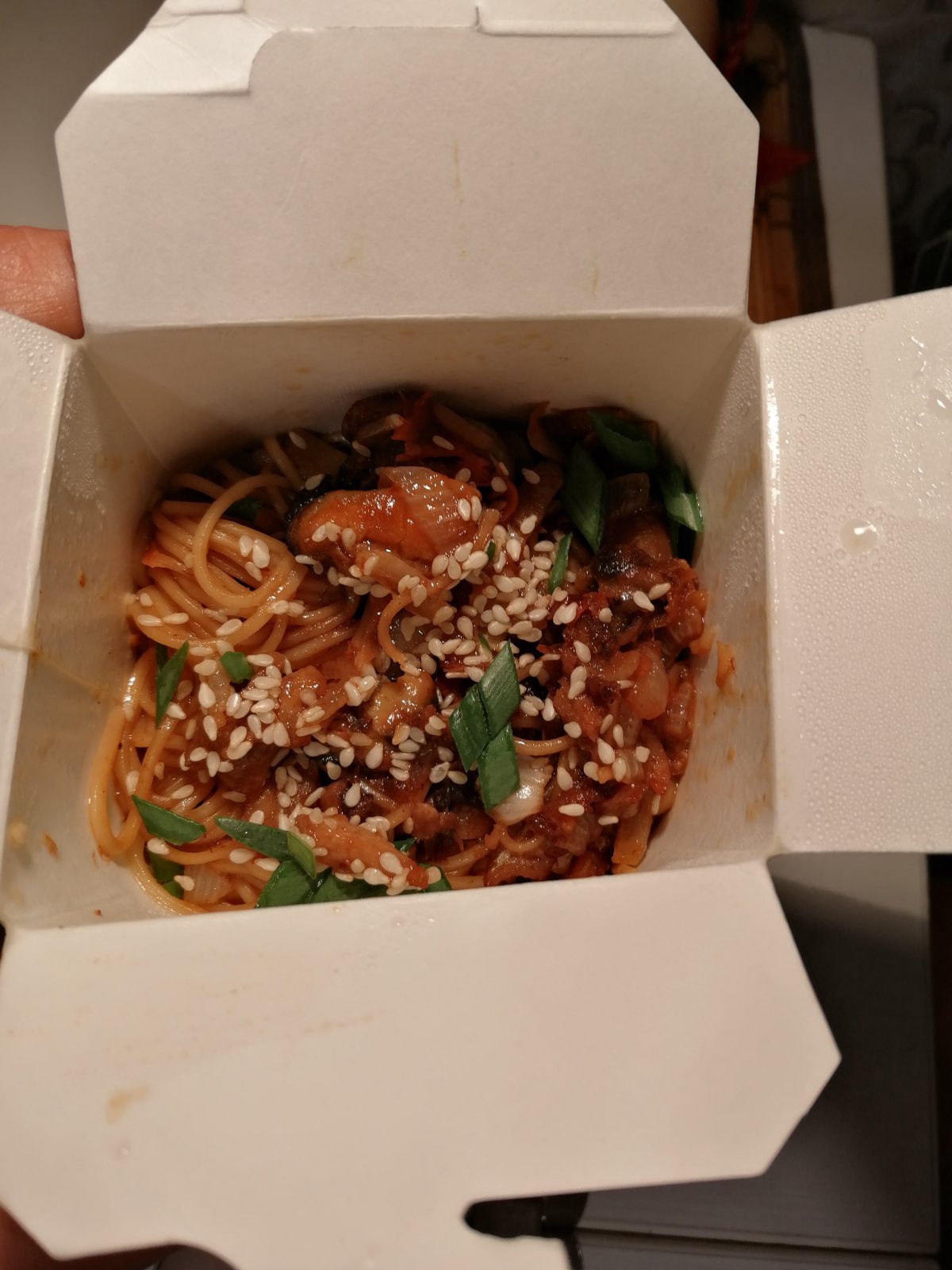Состав: лапша яичная, соус устричный, перец чили, морской коктейль, лук, имбирь |