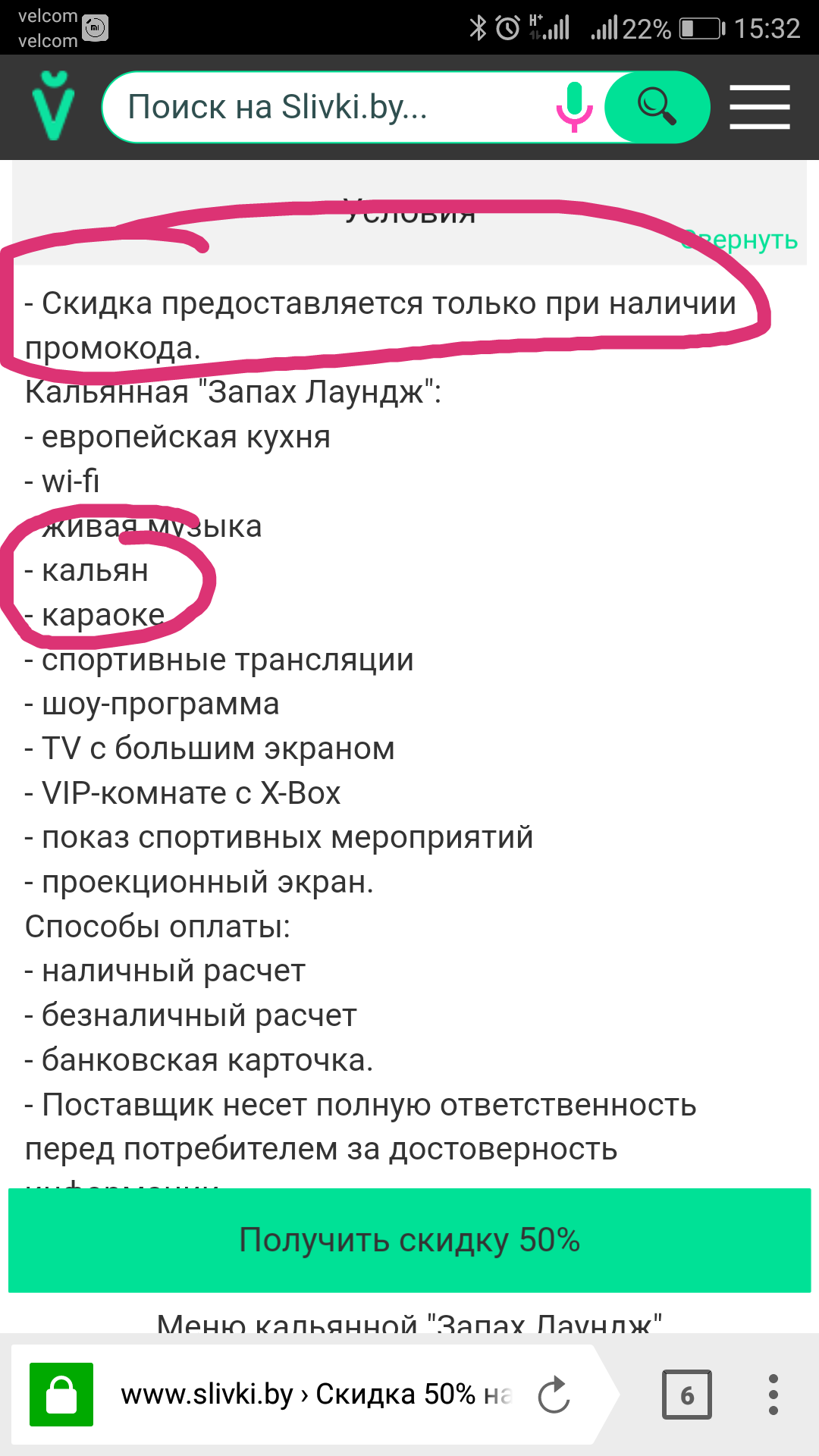 - Промокод дает право на скидку 50% на все меню в кальянной "Запах Лаундж".
