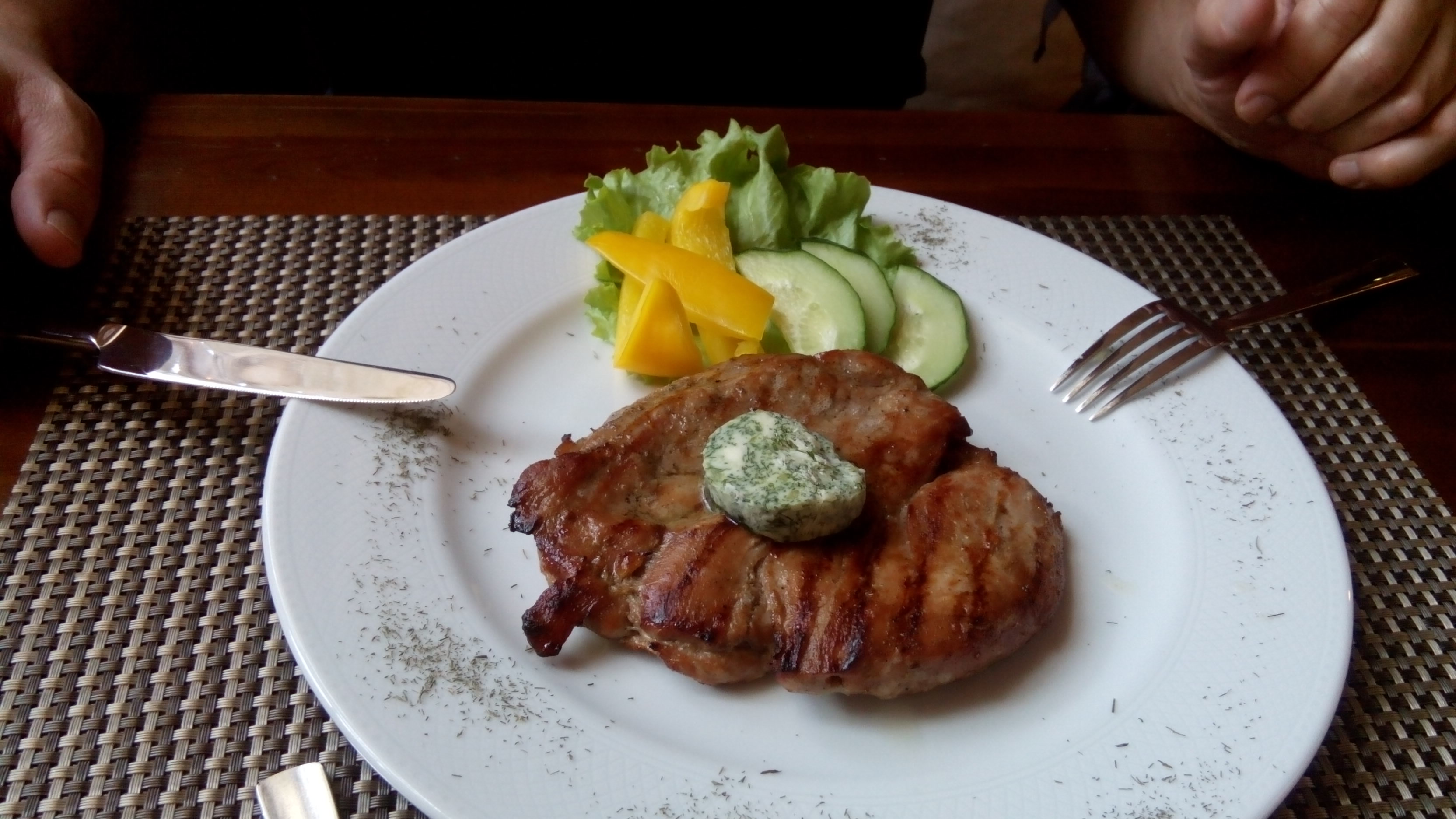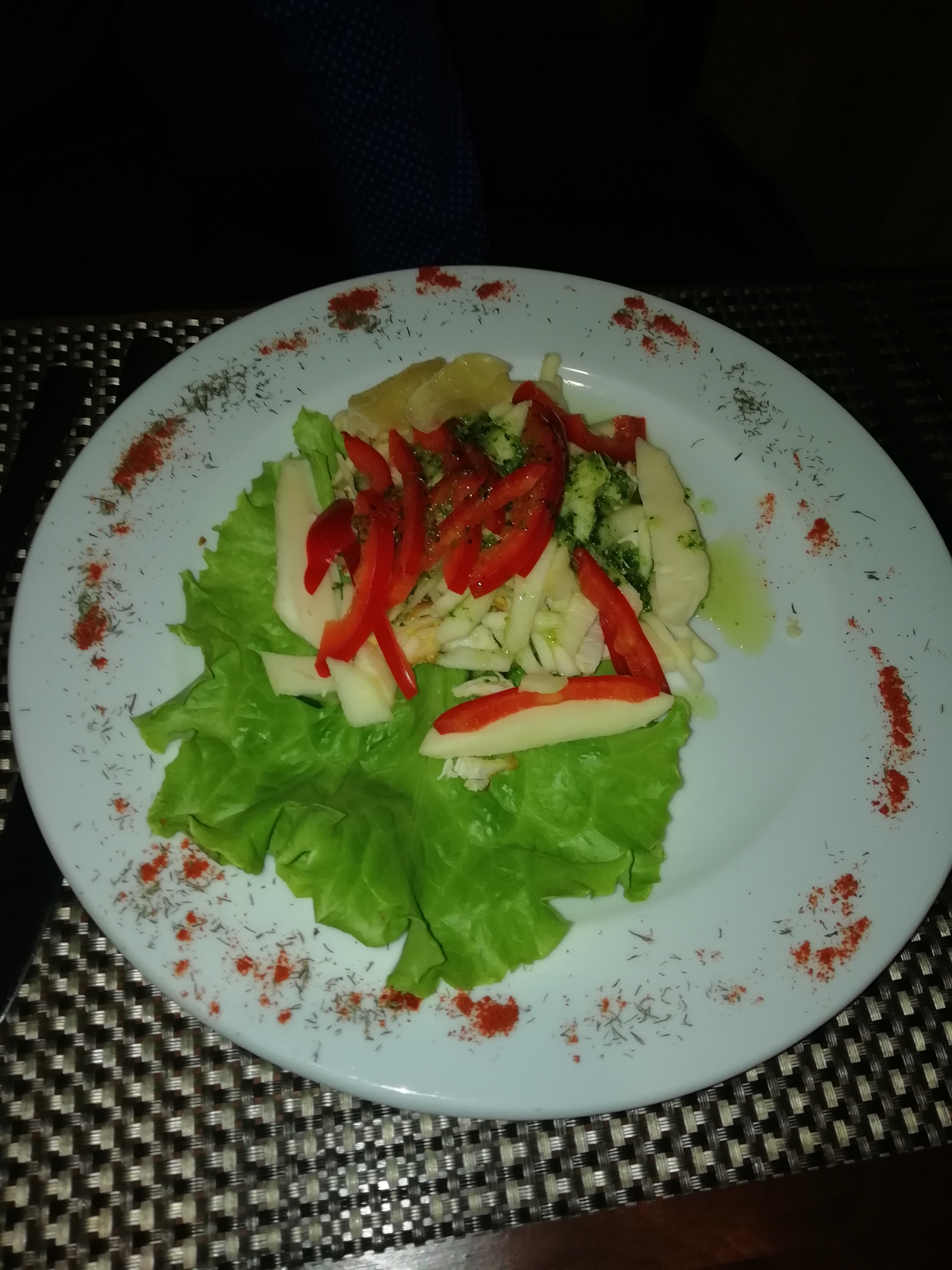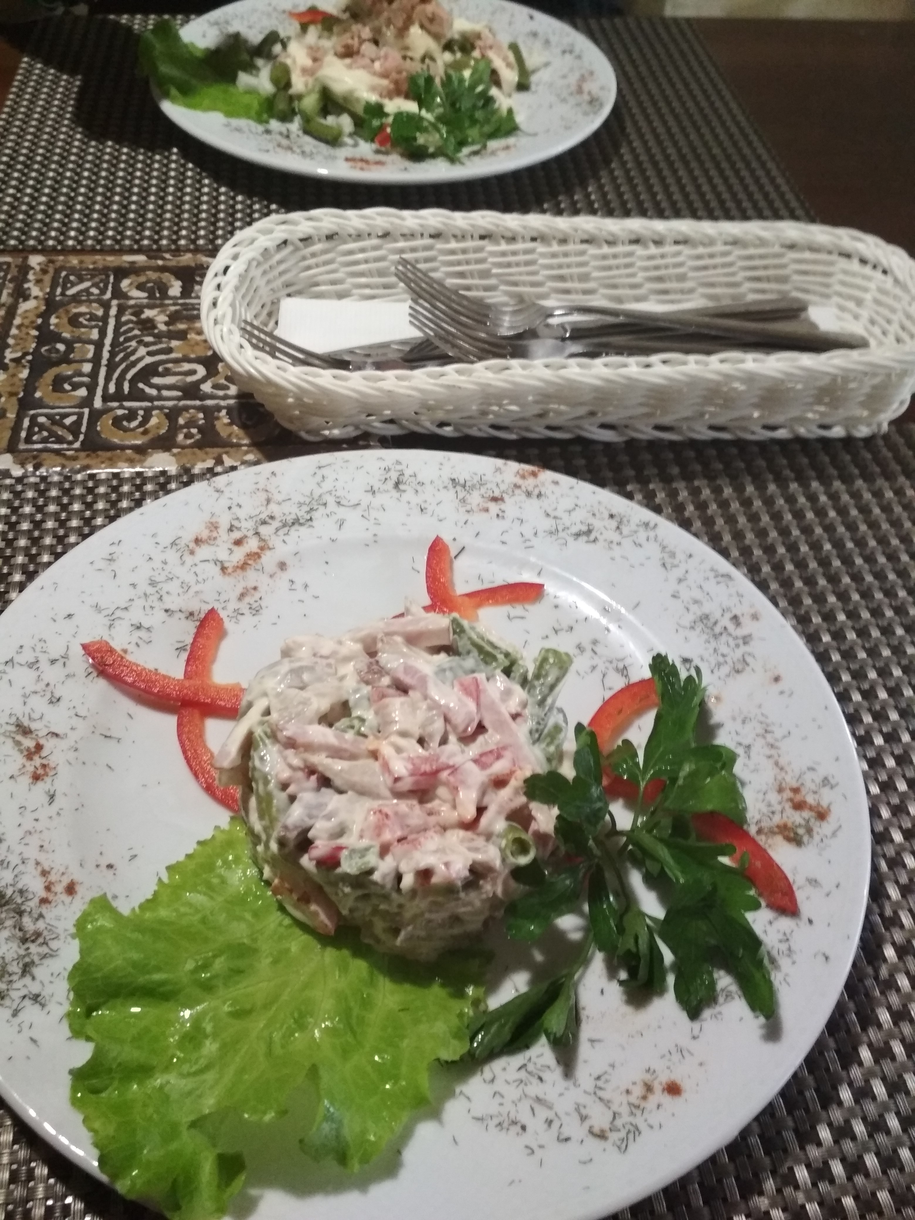 Ужинали в канун корпоративов, в ресторане были ещё 2 пары. Всё тихо, спокойной и приятная отмосфера. Порции соответствуют описанию.