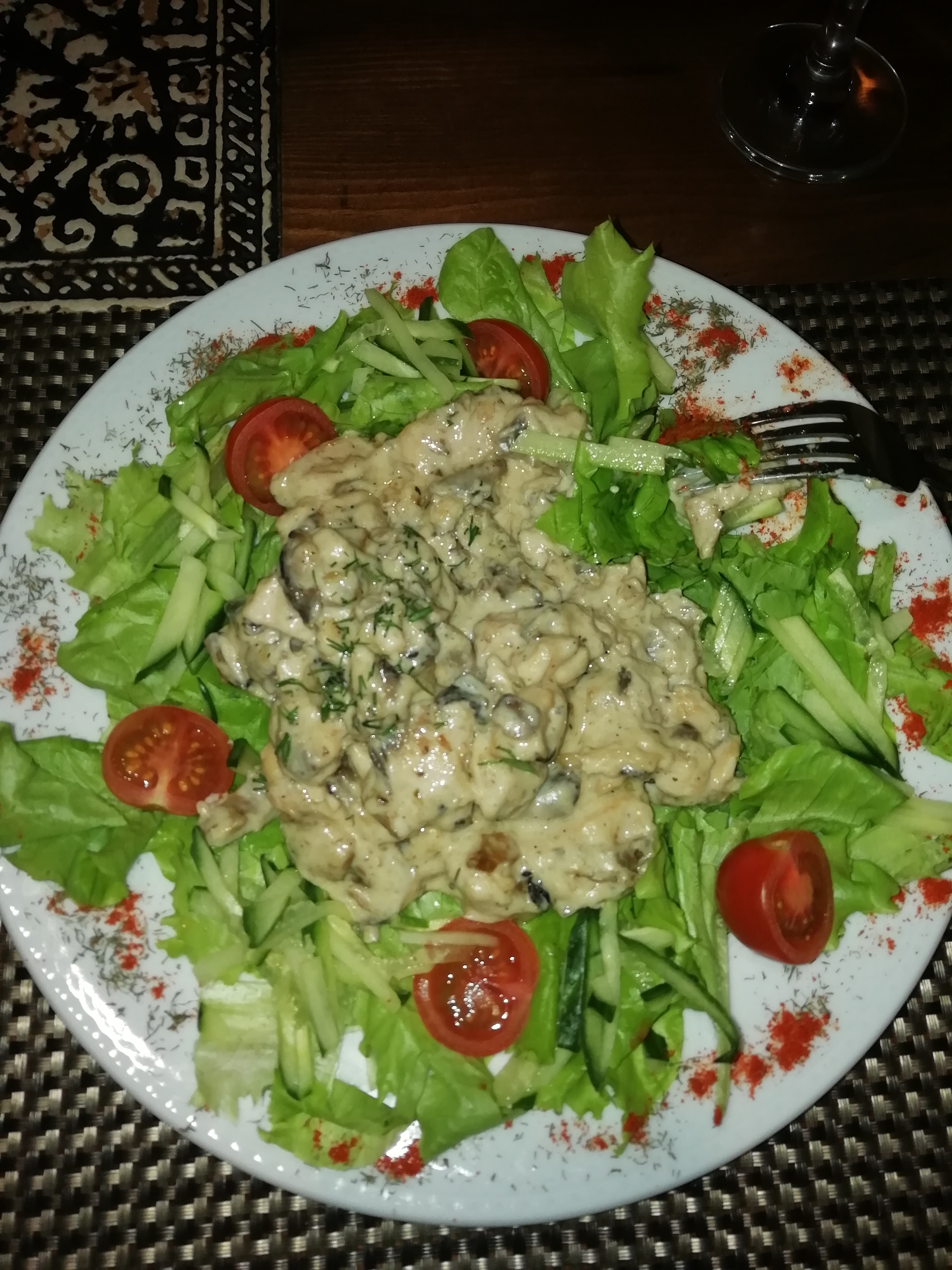 (цыпленок, шампиньоны, сливки, огурцы, томаты, заправка для салата, томаты Черри)