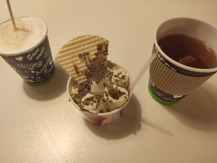 Приходили семьей в эти выходные,брали 2 сета: один планировали с орео для младшей,второй с ягодами. Когда младшенькая увидела в меню вариант с рафаэлло закапризничала,уперлась ,дайте ей с кокосиком🙏🙏 Продавец был ну очень добр и в виде исключения сделал нам рафаэлловое с дынной основой( ну очень вкусно вышло,приятно удивились что самих вкусов мороженого много,можно любые перечисленные в акции начинки класть в имеющиеся вкусы)  Капучино горячий,крепкий,в общем вылазка удалась на все 💯👍