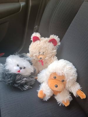Ребёнку вынесли пакет мягких игрушек, игрушку подарили, поиграли в дартс, есть мяч и машинка