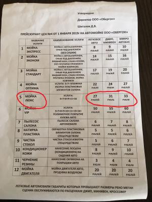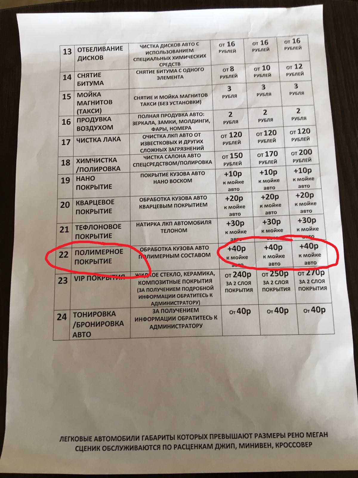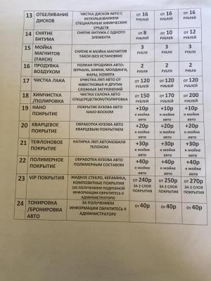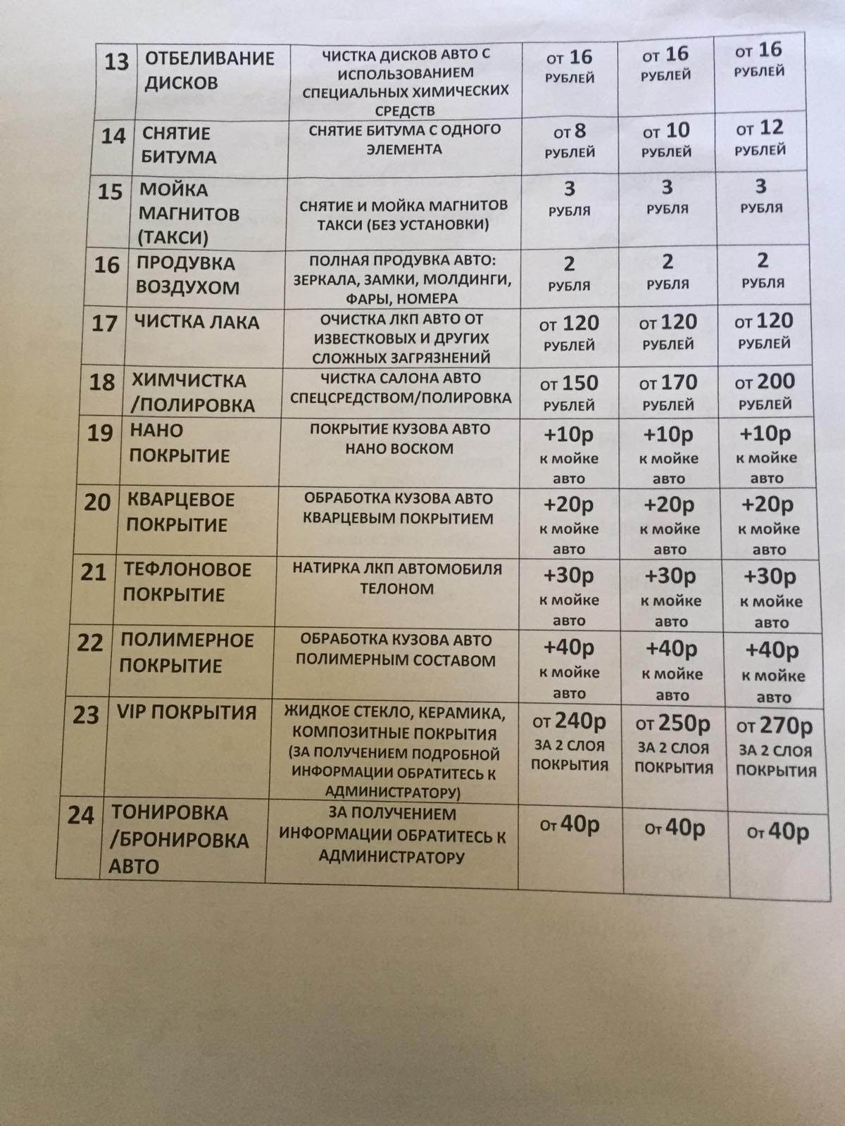 - комплекс L (мойка авто, сушка, продувка воздухом, чистка ковриков, мойка проемов, чернение резины, пылесос салона и багажника, обработка пластика спецсредством, мойка стекол, полимерное покрытие):
