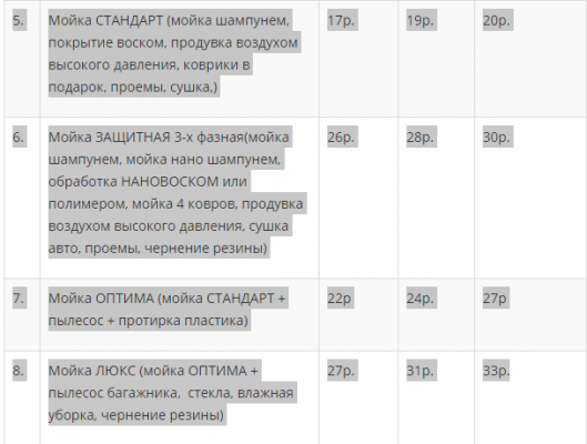 - комплекс летний (мойка авто, нано воск, сушка, продувка воздухом, чистка ковриков, пылесос салона (без багажника), мойка проемов, чернение резины):