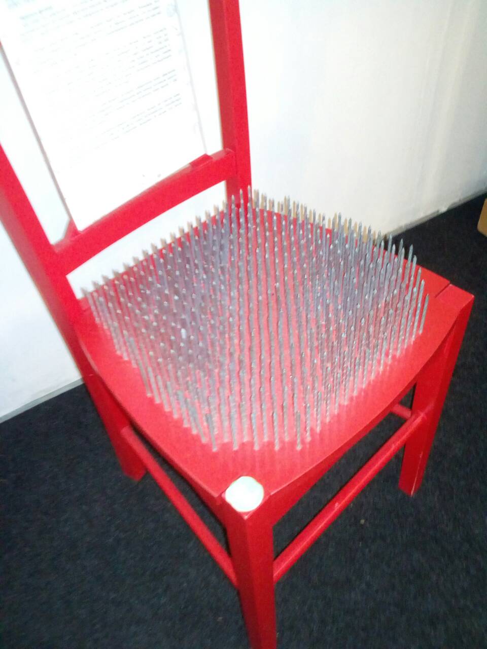 Каждый может почувствовать себя йогом и посидеть на стуле с гвоздями. Когда посетителям предлагают присесть на него у собравшихся сохраняется скептицизм, но после словесного заверения, что с ними ничего не случится, и визуального подтверждения, осмелевший народ почти что выстроился в очередь чтобы испытать эти «острые» ощущения и получить хороший первый урок по физике.