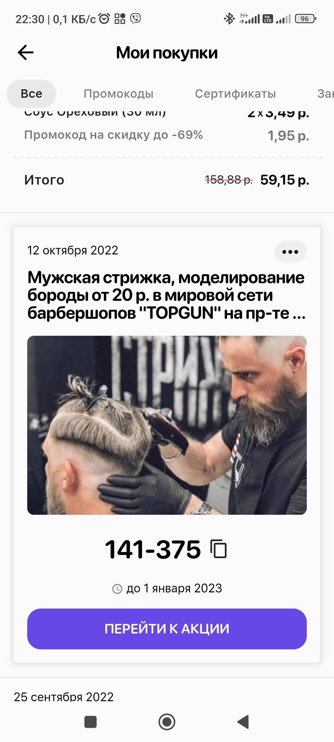 - Промокод дает право на скидку до 50% на услуги в барбершопе "TOPGUN"