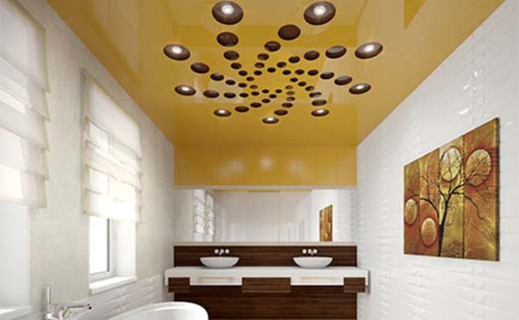Глянцевые натяжные потолки - отличный способ создать интерьер в стиле хай-тек или модерн. Сегодня пленка ПВХ, из которой изготовляется потолочная конструкция, имеет более ста различных оттенков и текстур - под мрамор, с разнообразными рисунками, под металл и многие другие. Глянцевый потолок способен зрительно сделать комнату больше. Он хорош для небольшой комнатки, ванной, бассейна.