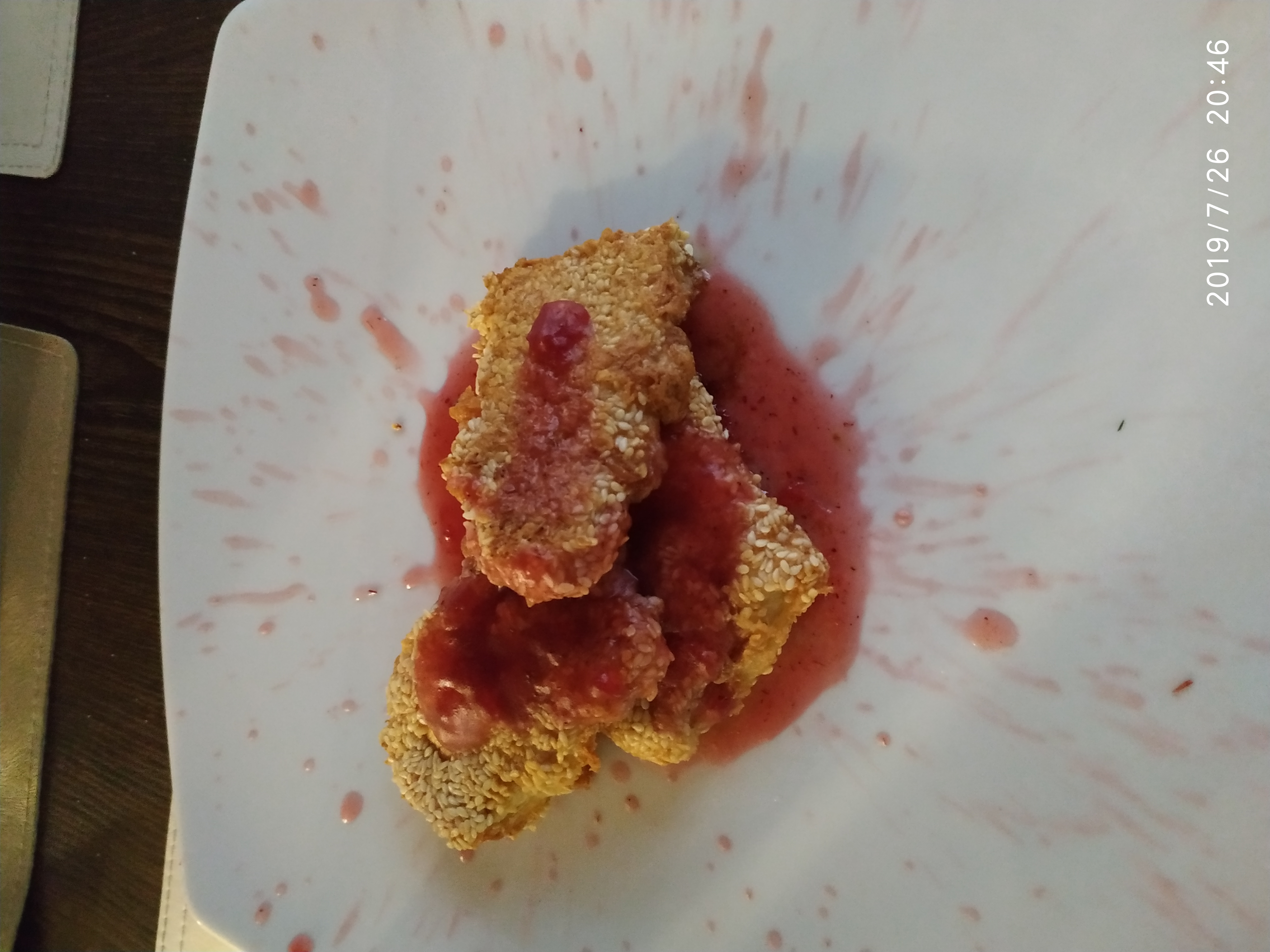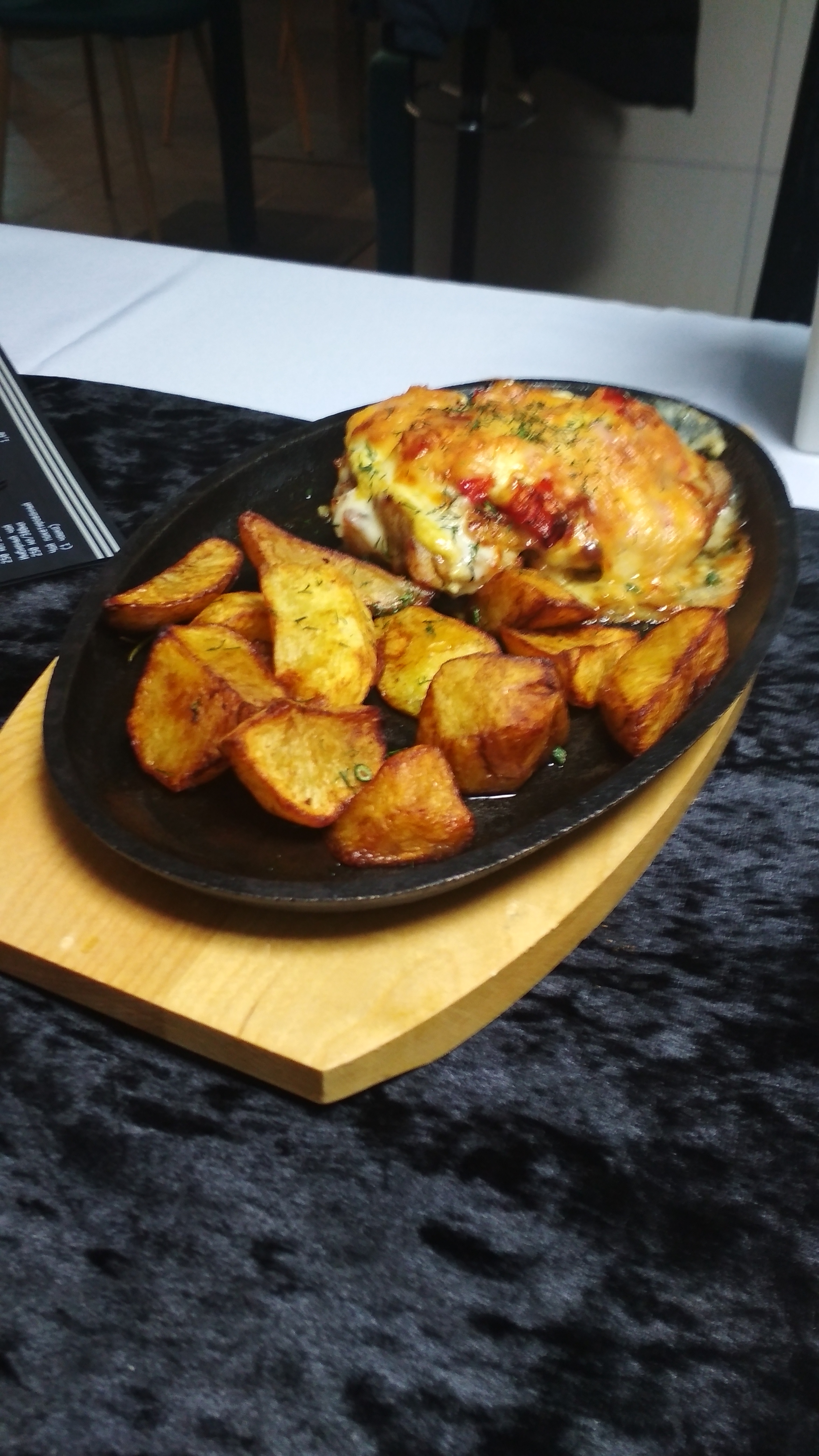 - наггетсы куриные с картофелем по-деревенски и сливочно-чесночным соусом (200 г/150 г/50 г)