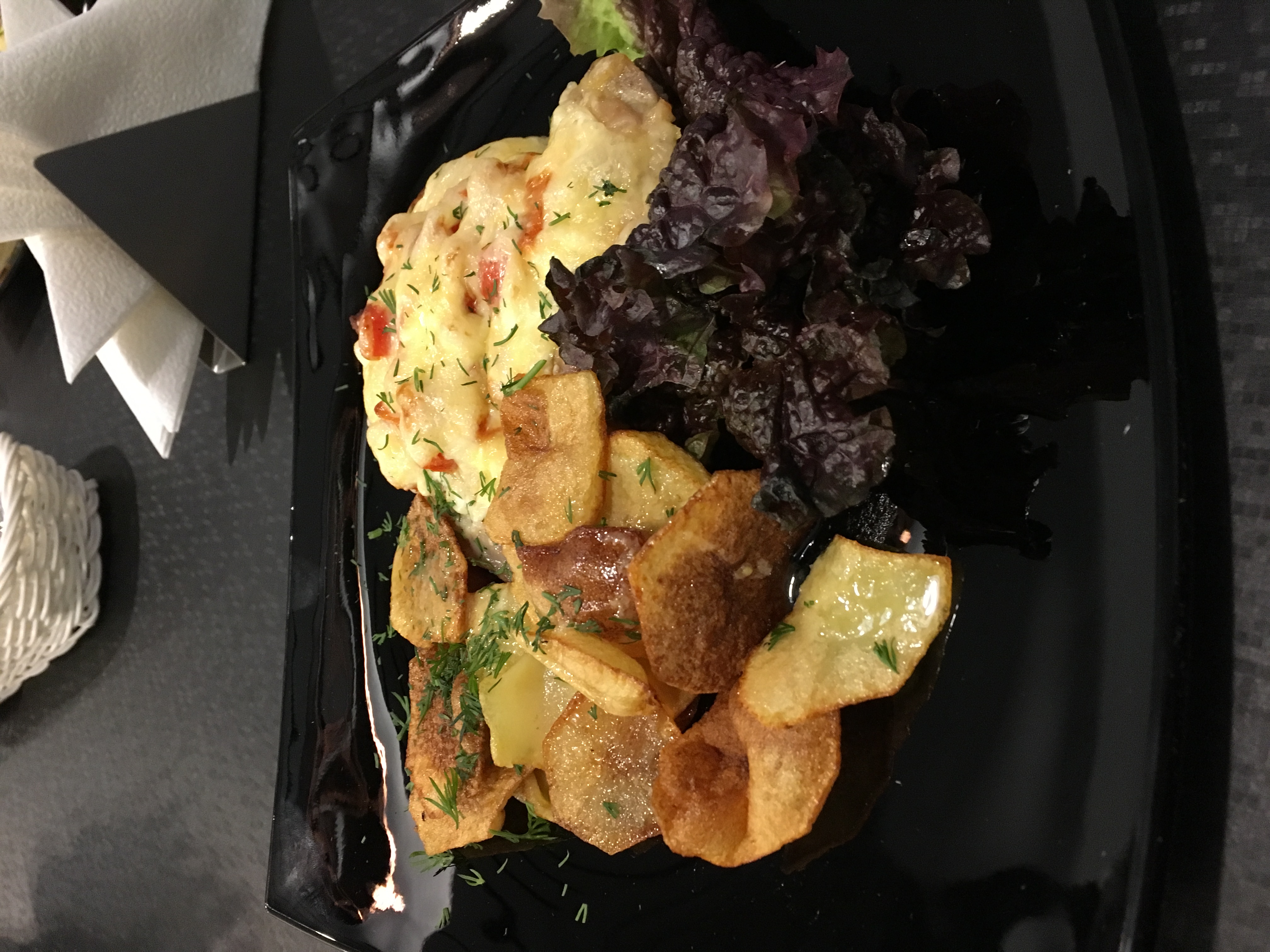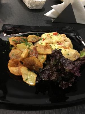 - наггетсы куриные с картофелем по-деревенски и сливочно-чесночным соусом (200 г/150 г/50 г)