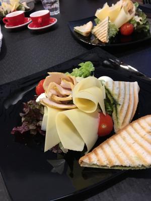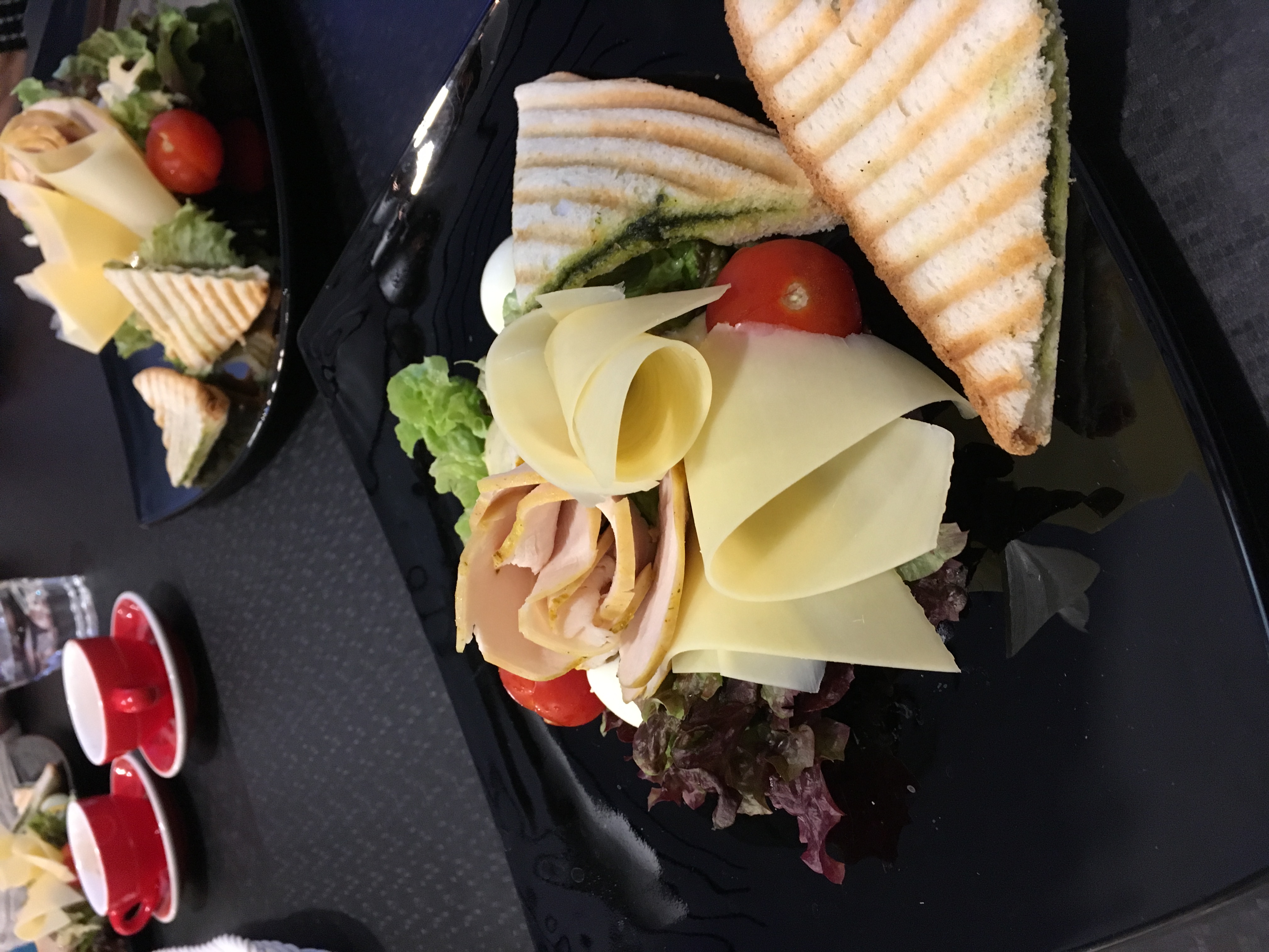 - салат "Цезарь" (220 г): салат айсберг, куриное филе, томат черри, яйцо перепелиное, соус фирменный цезарь, сыр пармезан, гренки