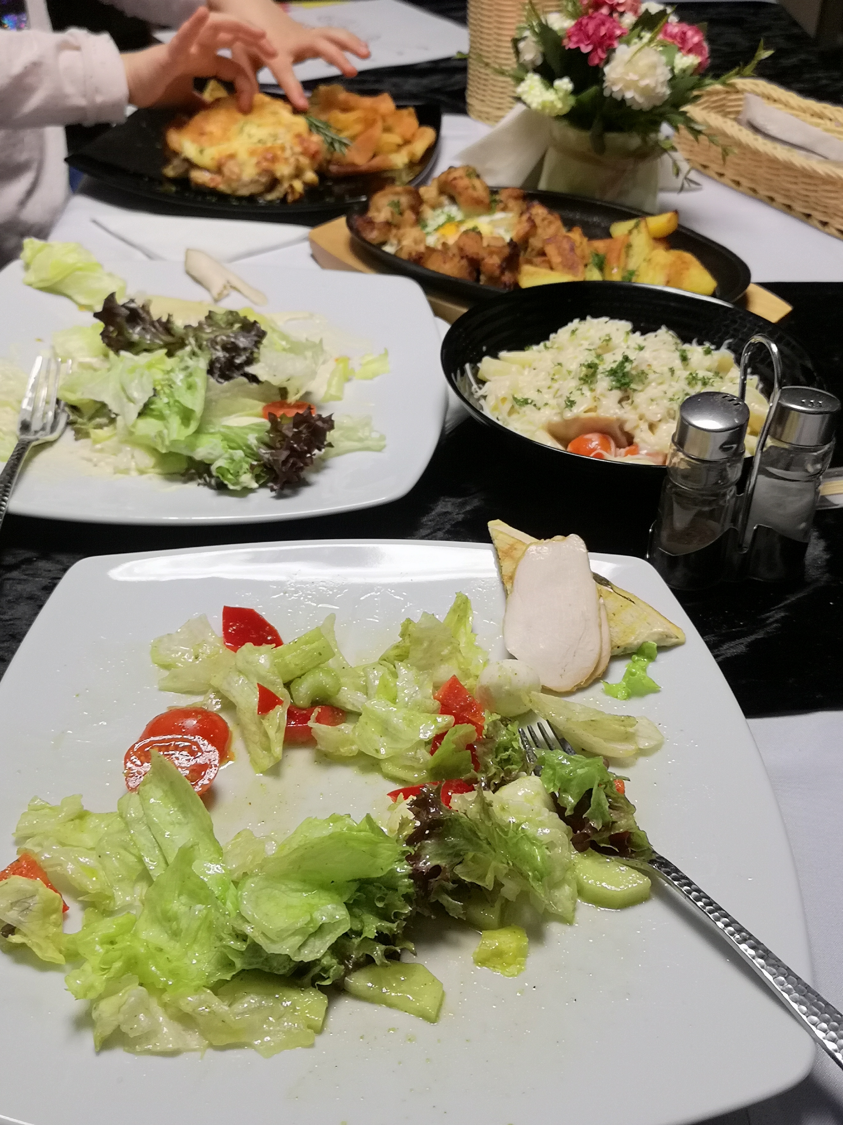- салат "Цезарь" (220 г): салат айсберг, куриное филе, томат черри, яйцо перепелиное, соус фирменный цезарь, сыр пармезан, гренки - 2 порции