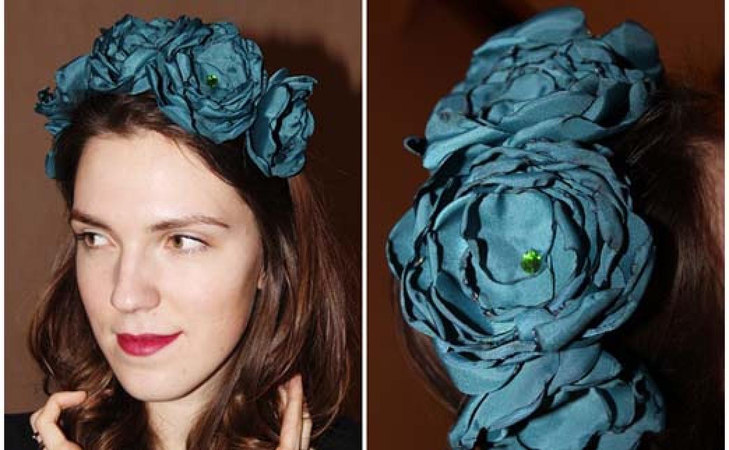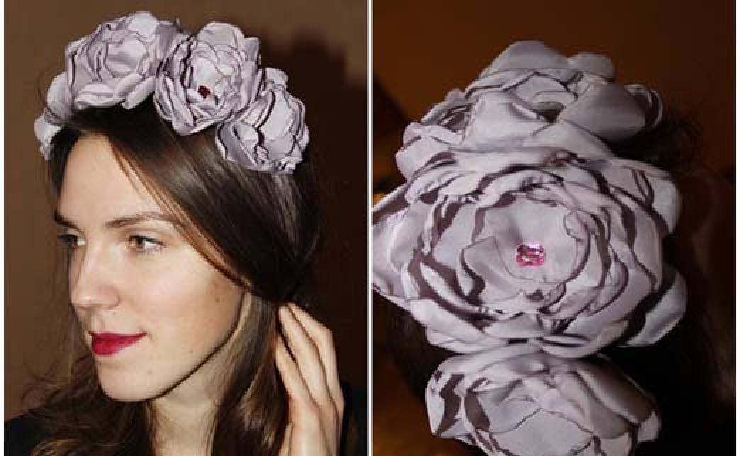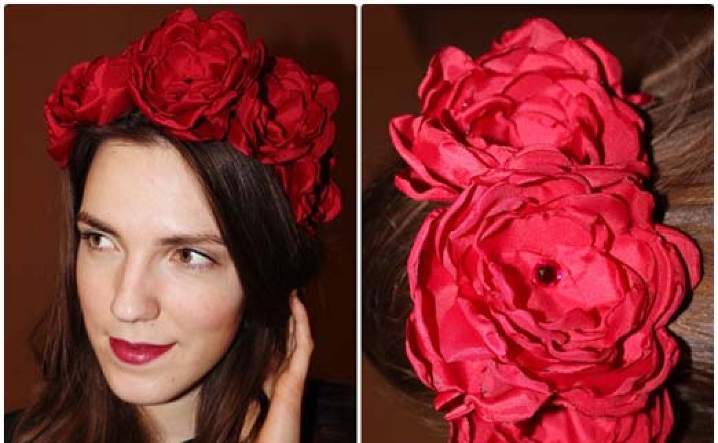 - Основа ободка - металлическая (черного цвета), цветы - ткани, украшенная стразами