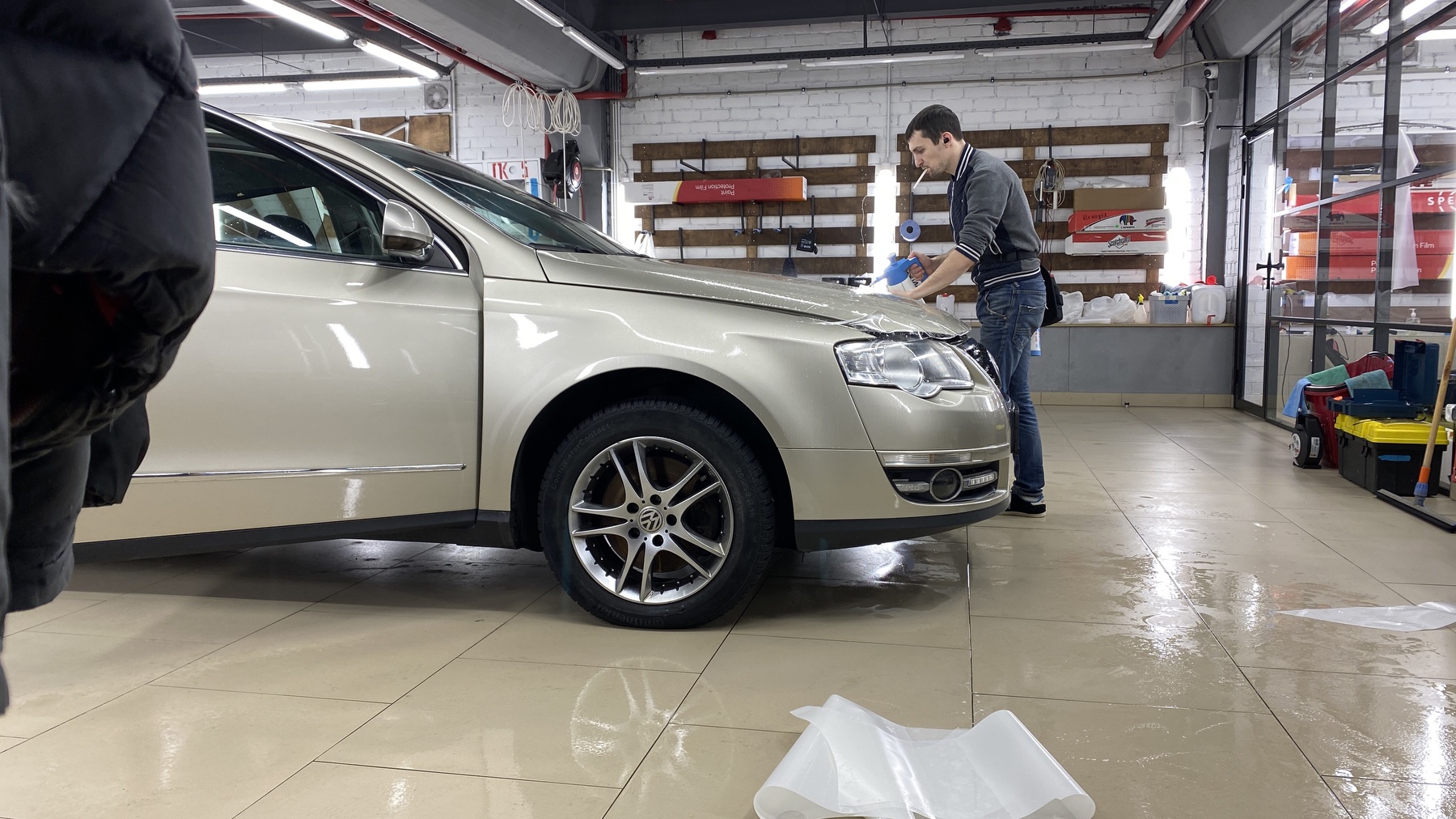 - после очистки кузова на пленку и поверхность автомобиля наносятся мыльный и клеевой растворы