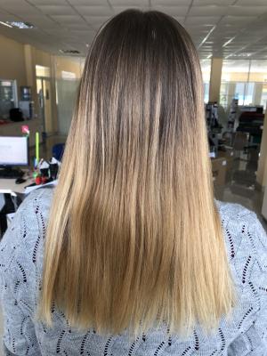 Здравствуйте !) подскажите пожалуйста стоимость такого окрашивания длина ниже лопаток , густые волосы , свой цвет как на фото «до»