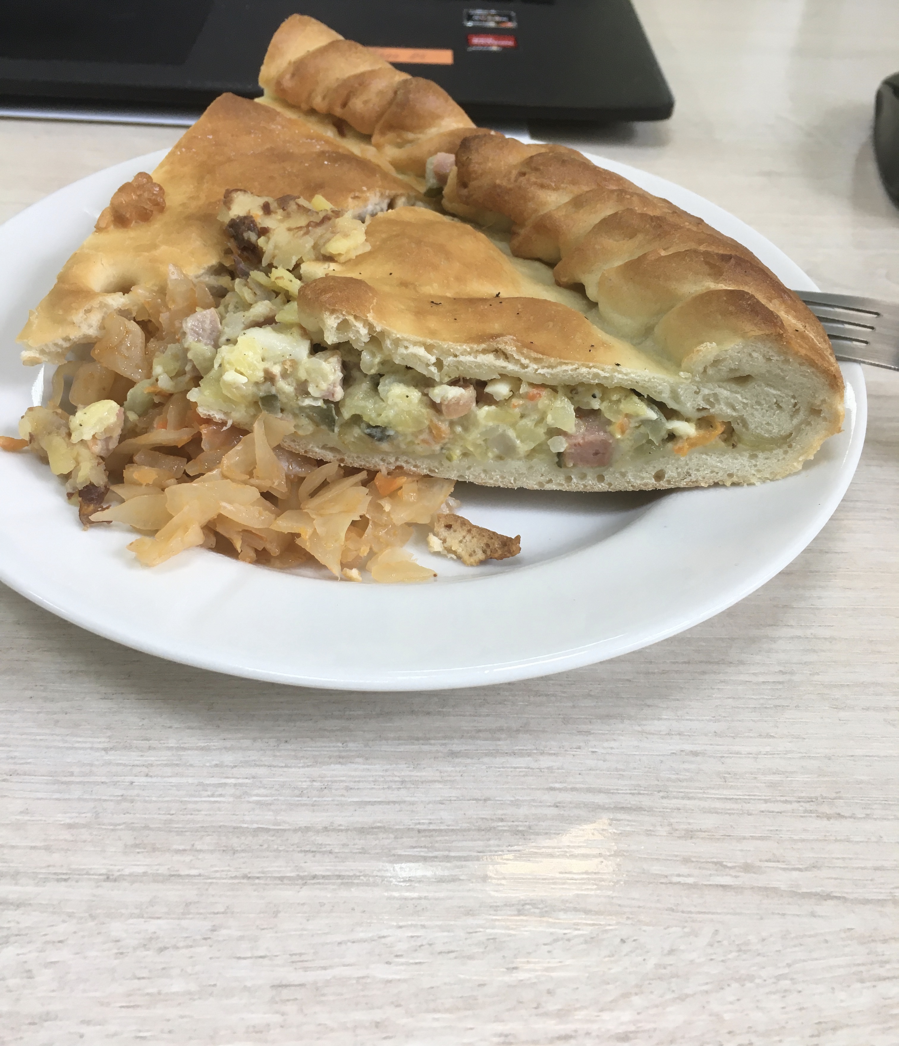 Состав: дрожжевое тесто, репчатый лук, сливочное масло, смесь перцев, соль, тушенная капуста, фарш из говядины и свинины