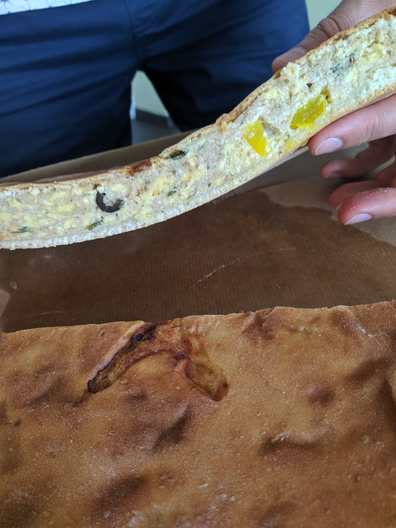 Заказывала два пирога: закрытый пирог с сыром и курицей 1300 г и закрытый пирог с сыром, красной рыбой и сладким перцем 1300 г. Если бы знала, что так разлетятся, взяла бы и третий) Пироги красивые, сытные, начинки много)
