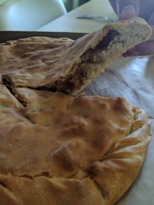Состав: дрожжевое тесто, репчатый лук, сливочное масло, смесь перцев, соль, тушенная капуста, фарш из говядины и свинины