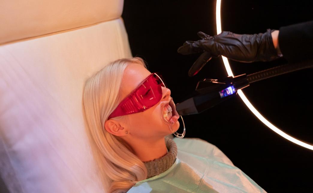 - наше оборудование - это новейшие LED-лампы (модельный ряд 2023 года) холодного синего и красного свечения. Красный свет благоприятно влияет на восстановление слизистой и взаимодействует с реминерализирующим гелем