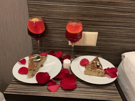 - декор номера, лепестки роз и сладкий комплемент от шеф-повара для романтического вечера
