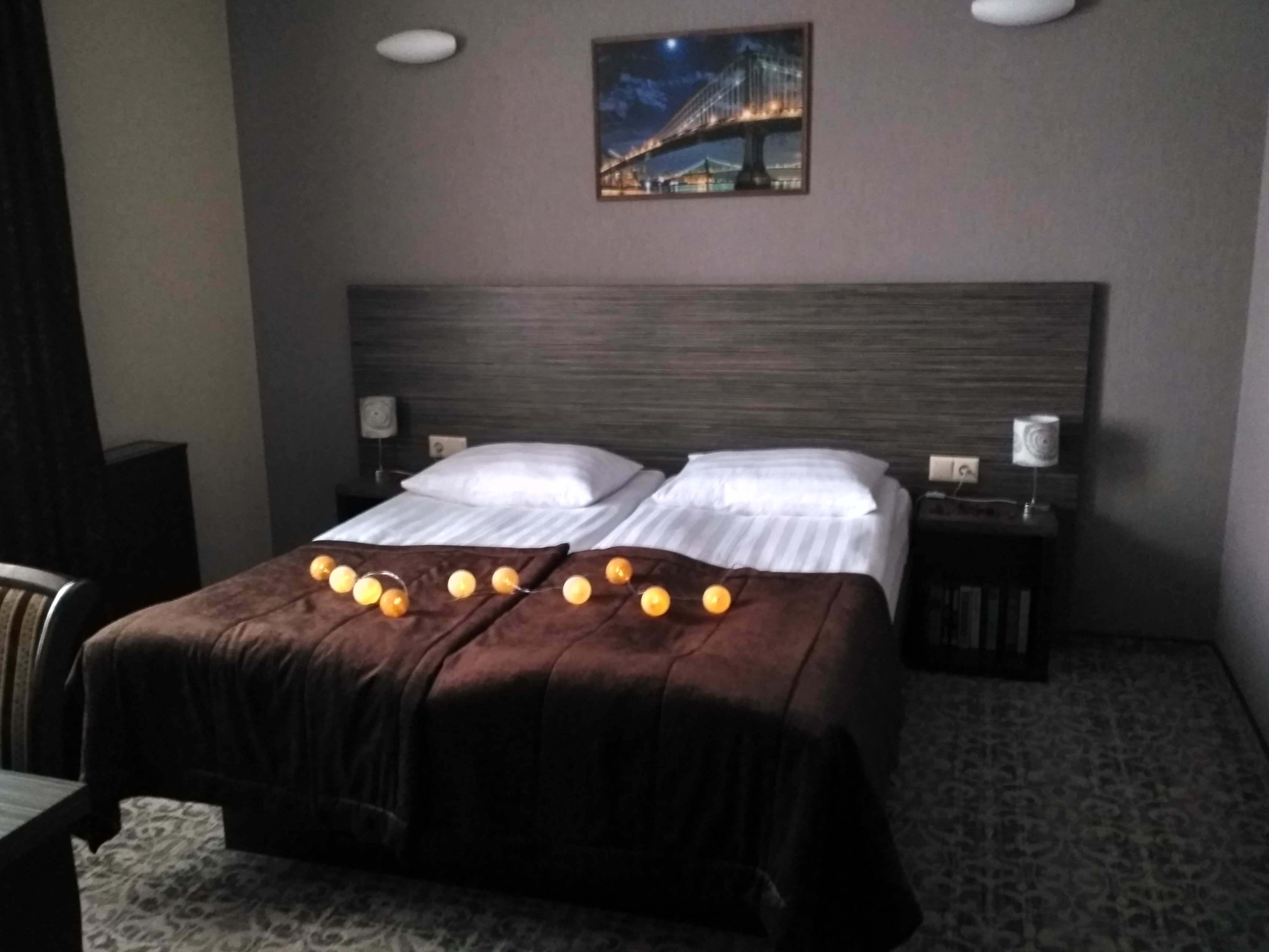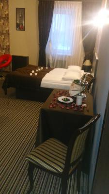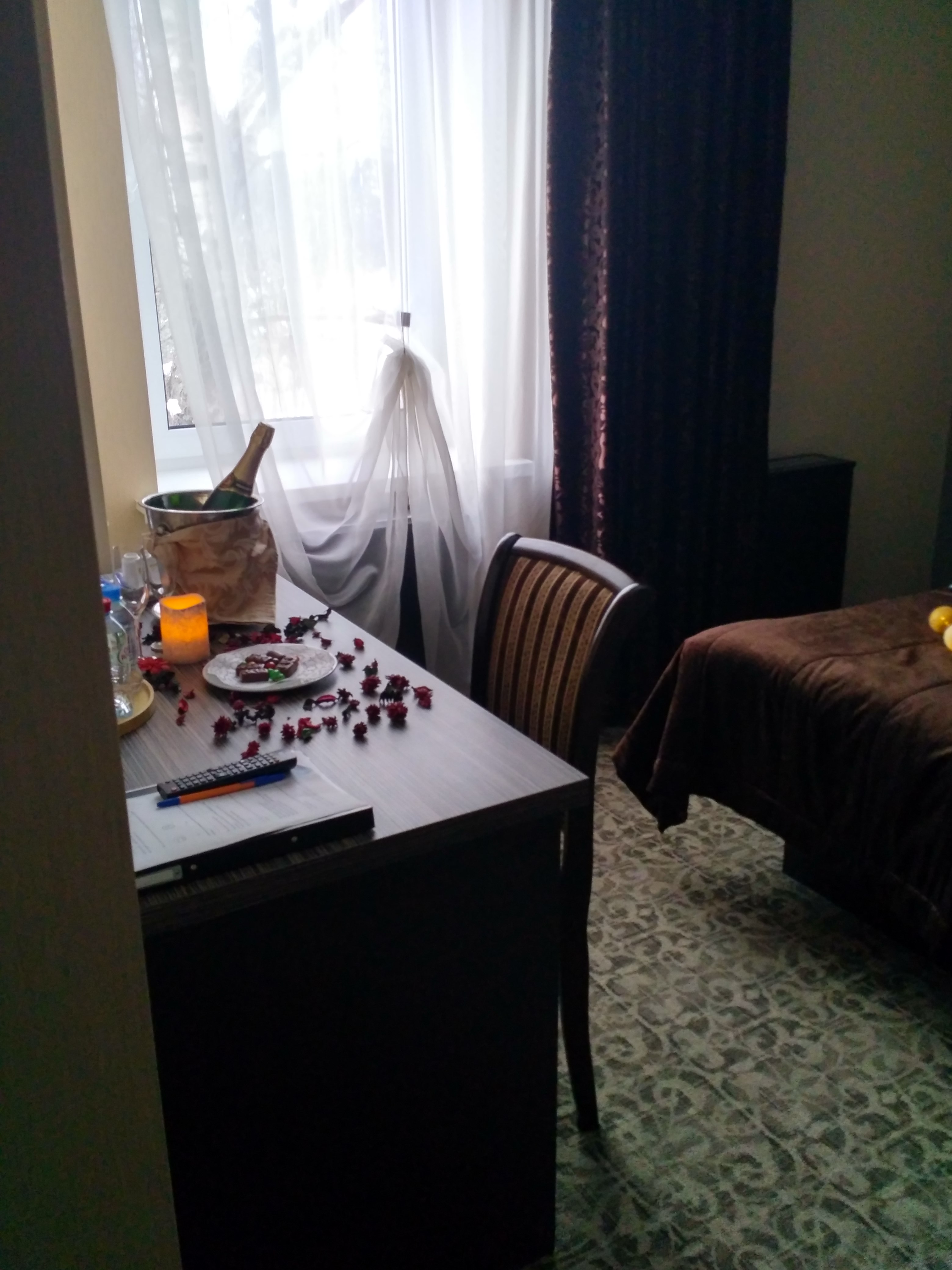 1) Мы выбрали номер "Стандарт", предполагающий романтический декор. Шампанское было охлажденное, персонал отеля на запрос о виде шампанского, пошел на встречу и было подготовлено запрашиваемое полусухое. НО - Кровать, состоящая из 2-х половинок, (для тех у кого дети, и кто больше нацелен выспаться) не предполагает романтику, на картинку не всматривался, поэтому были растроены. С деревянным разделителям по-середине.
