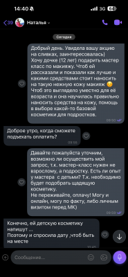 До мастер-класса и не дошли. Интересовалась для дочки-подростка, задавала вопросы. На что мне отвечали в такой подаче, будто я что-то мастеру должна. О тактичности видимо мастер и не слышал. Ужасное общение! Мастера волновала лишь оплата) это первое ее сообщение, все мои вопросы она просто проигнорировала.