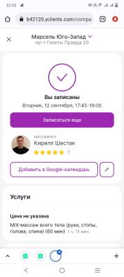 Посетила студию массажа EFFLEURAGE и получила заряд энергии и восстановление всего организма. Большое спасибо Дмитрию за массаж Шведский бриз .Очень уютный салон расслабляющая музыка приглушенный свет и вкусный чай.