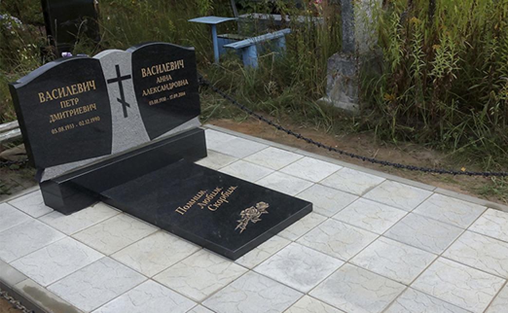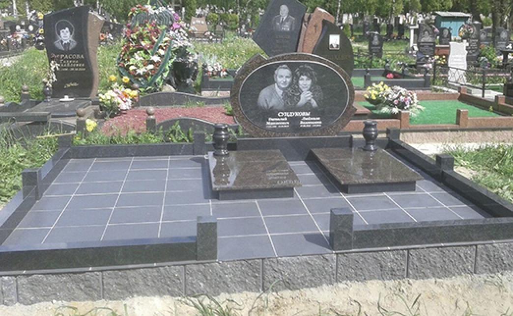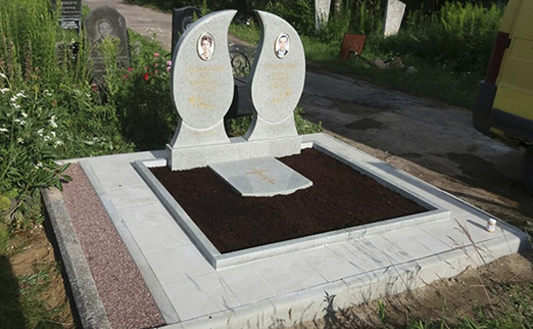 Двойной памятник: Стела 100*60*5, подставка 60*20*15, цветочница 5*8 2,5 м.п., гравировка портрет 2 шт., текст 2 шт., эпитафия, цветы, крест.