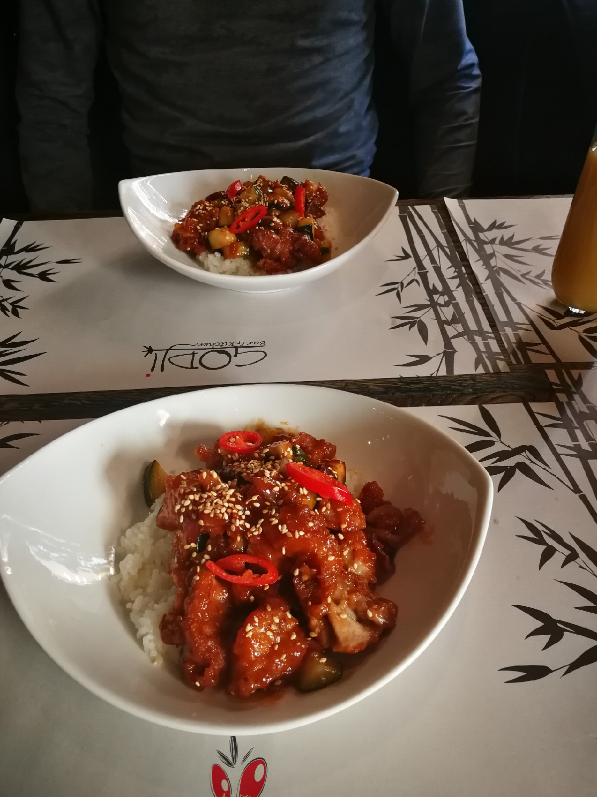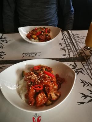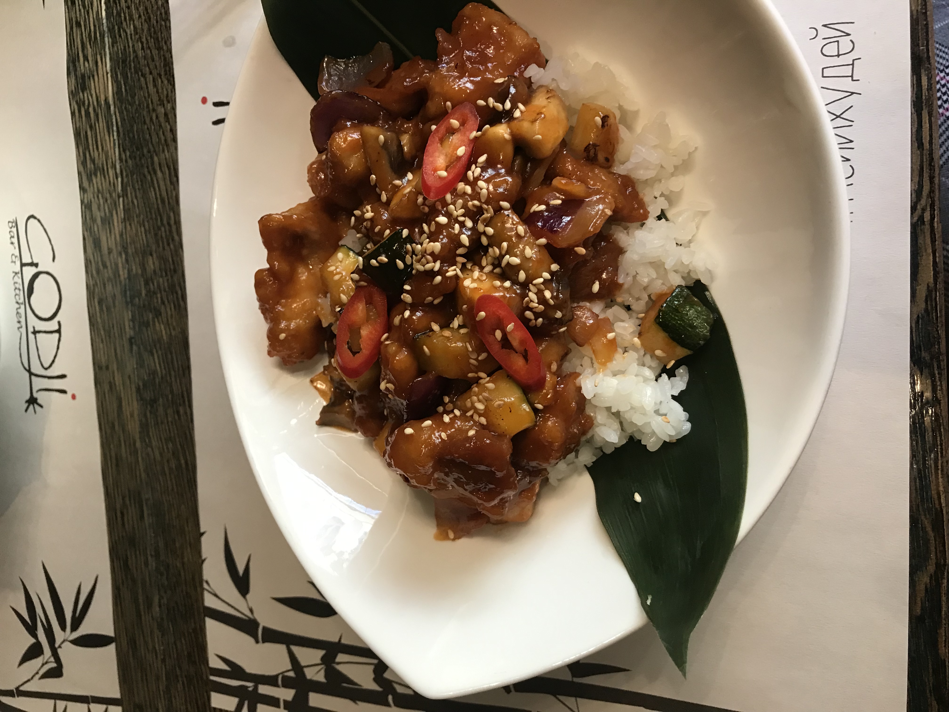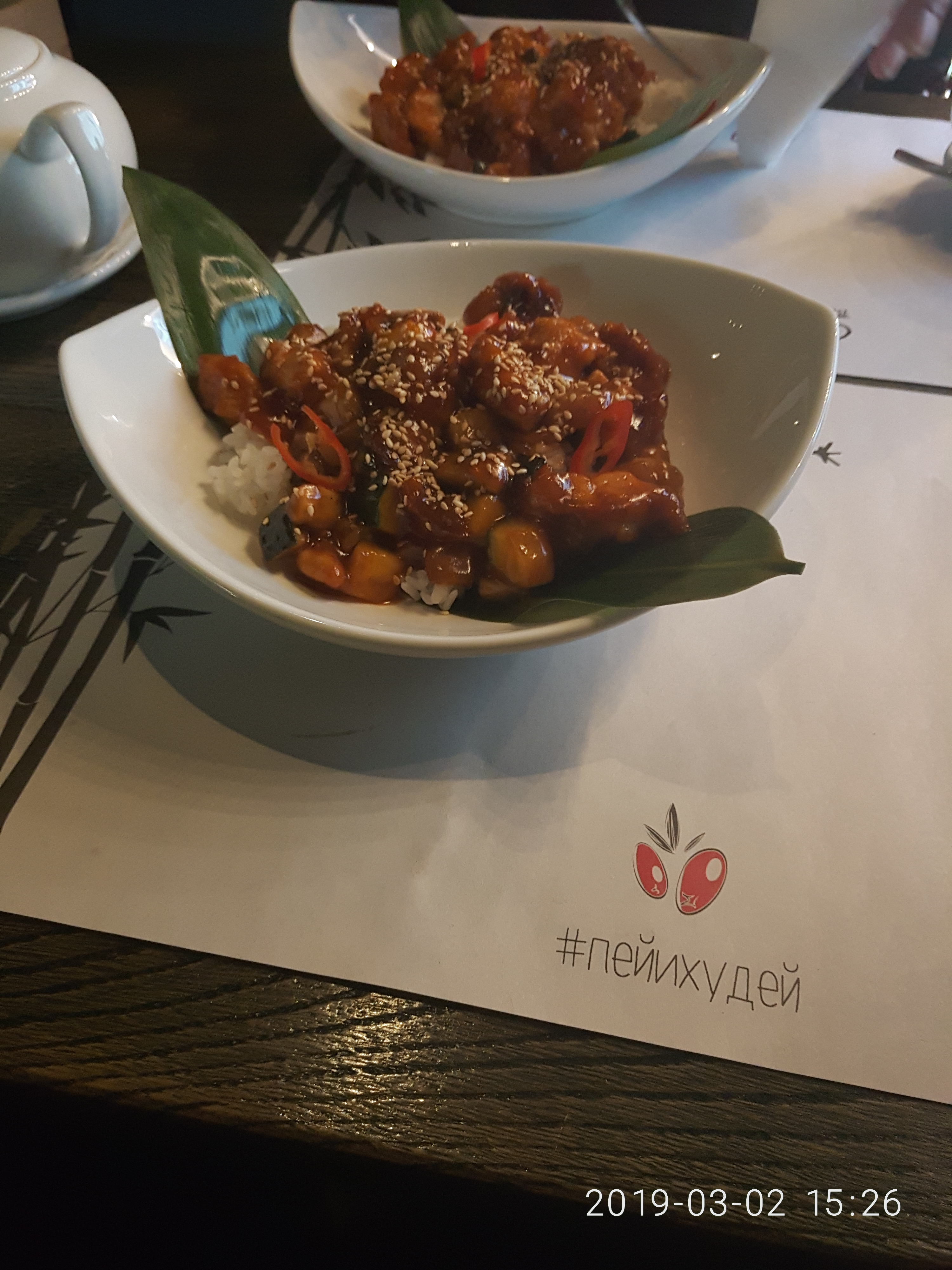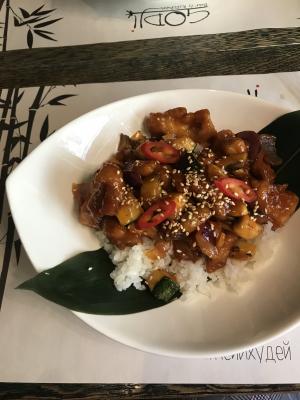 - Цыпленок в кисло-сладком соусе: цыпленок с овощами и арахисом, обжаренный в кисло-сладком соусе, зеленый лук, подается с паровым рисом (две порции, 740 г)