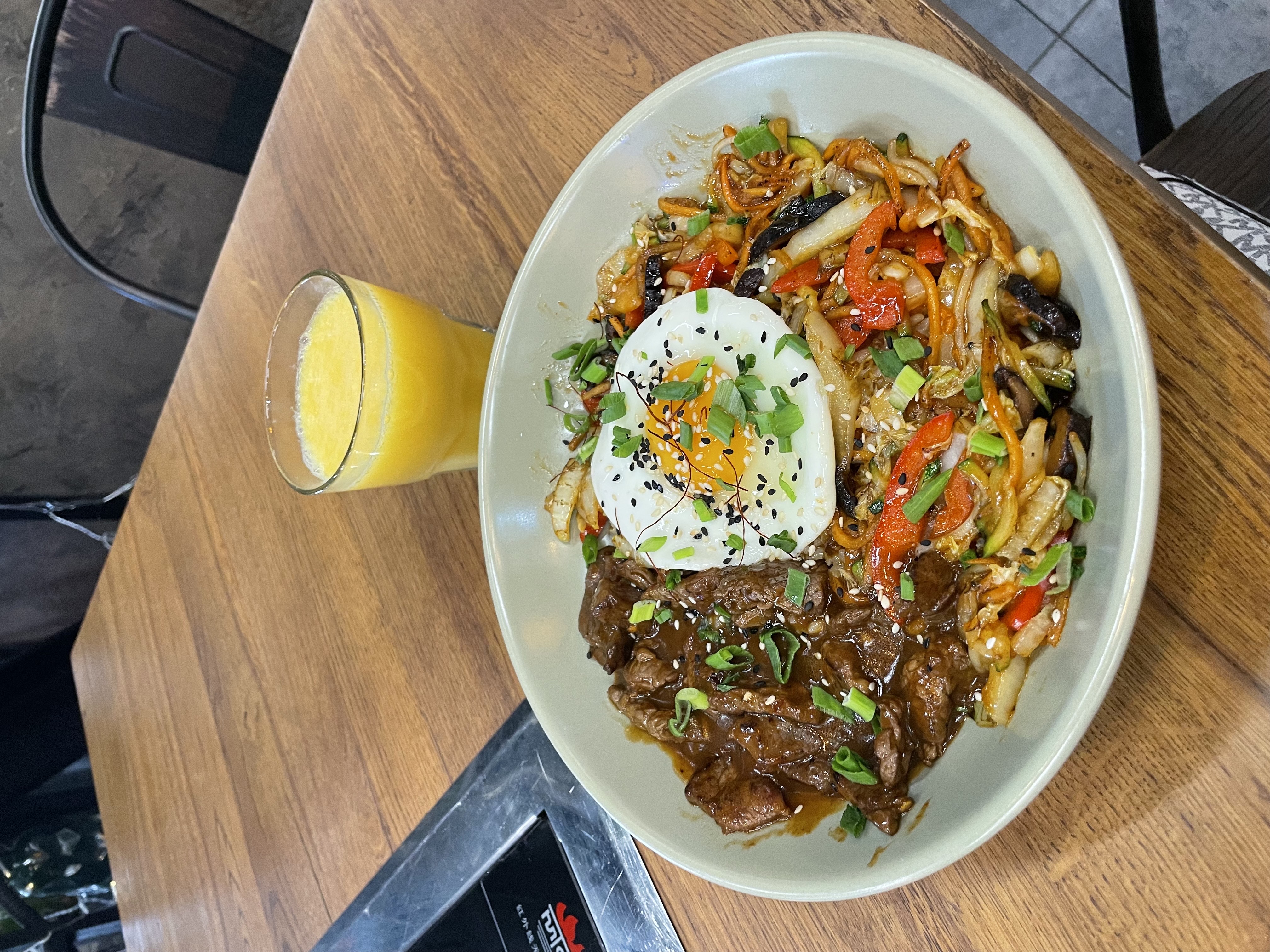 Состав: рис с курицей в остром соусе, цукини, морковью, красным перцем, ростками маша, грибами, луком, кунжутом, перцем чили и жареным яйцом