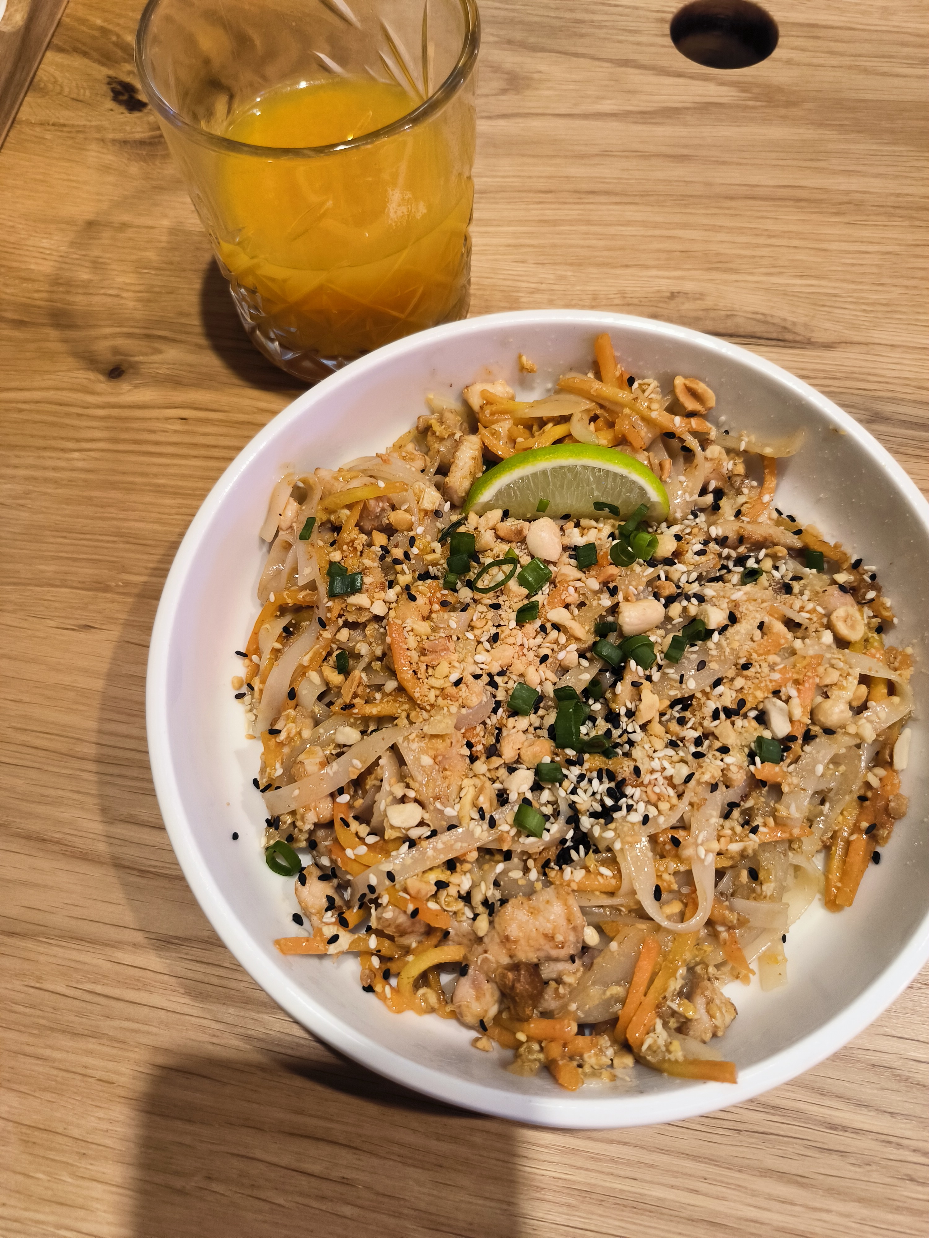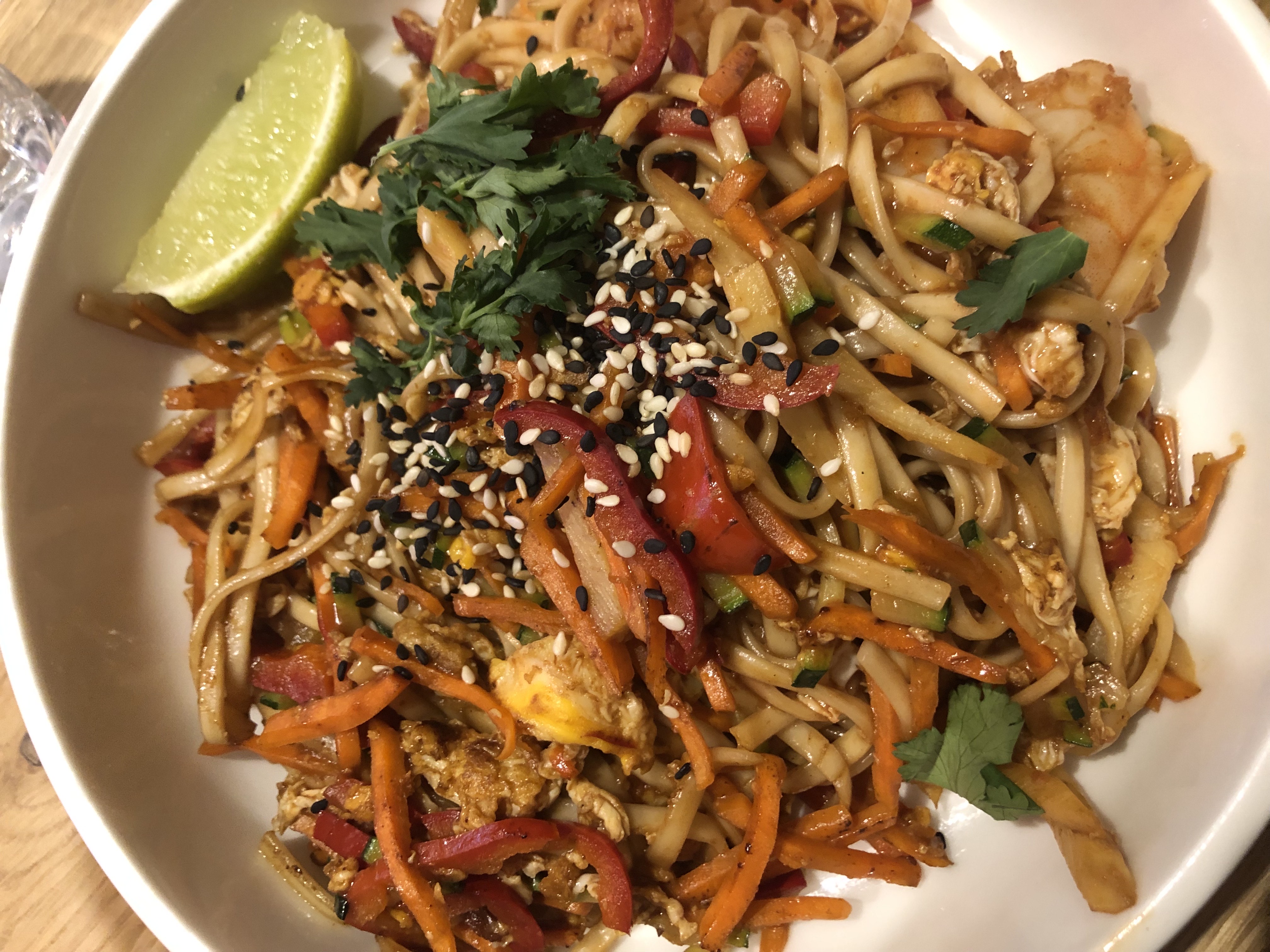 Состав: рисовая лапша с курицей, луком, морковью, лаймом, яйцом, ростками маша, кунжутом, креветочным маслом и обжаренным арахисом в соусе пад тай