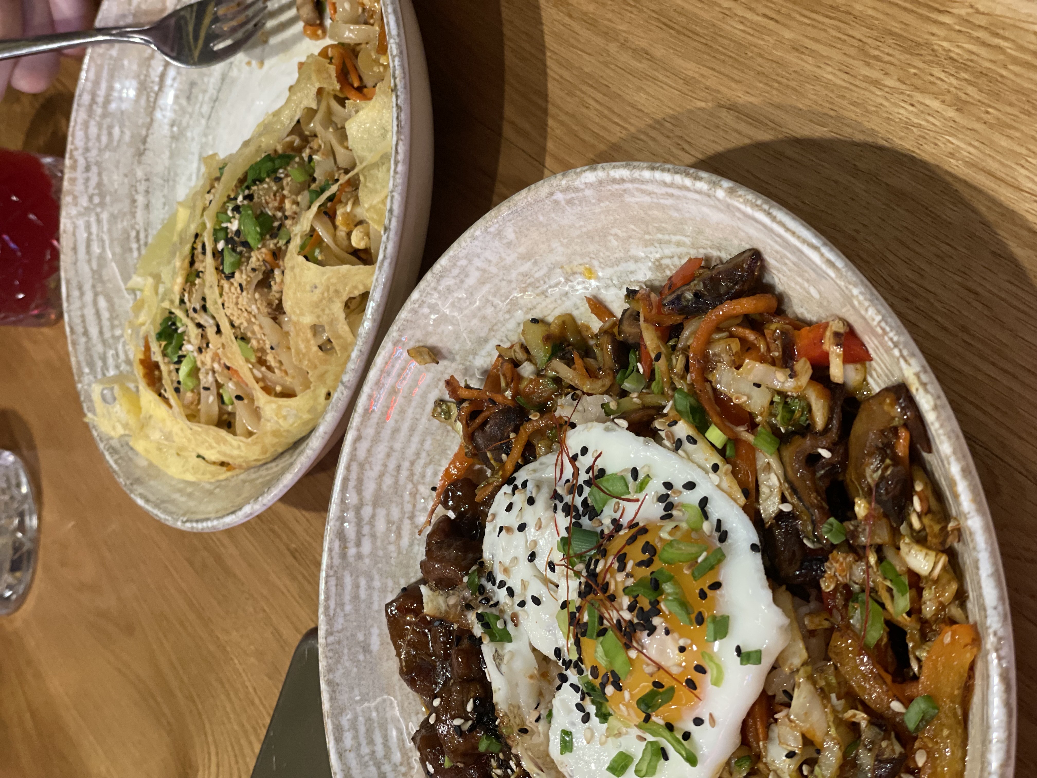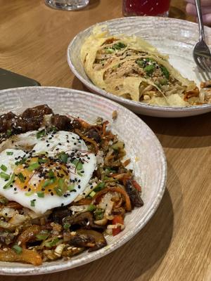 Состав: рис с курицей в остром соусе, цукини, морковью, красным перцем, ростками маша, грибами, луком, кунжутом, перцем чили и жареным яйцом