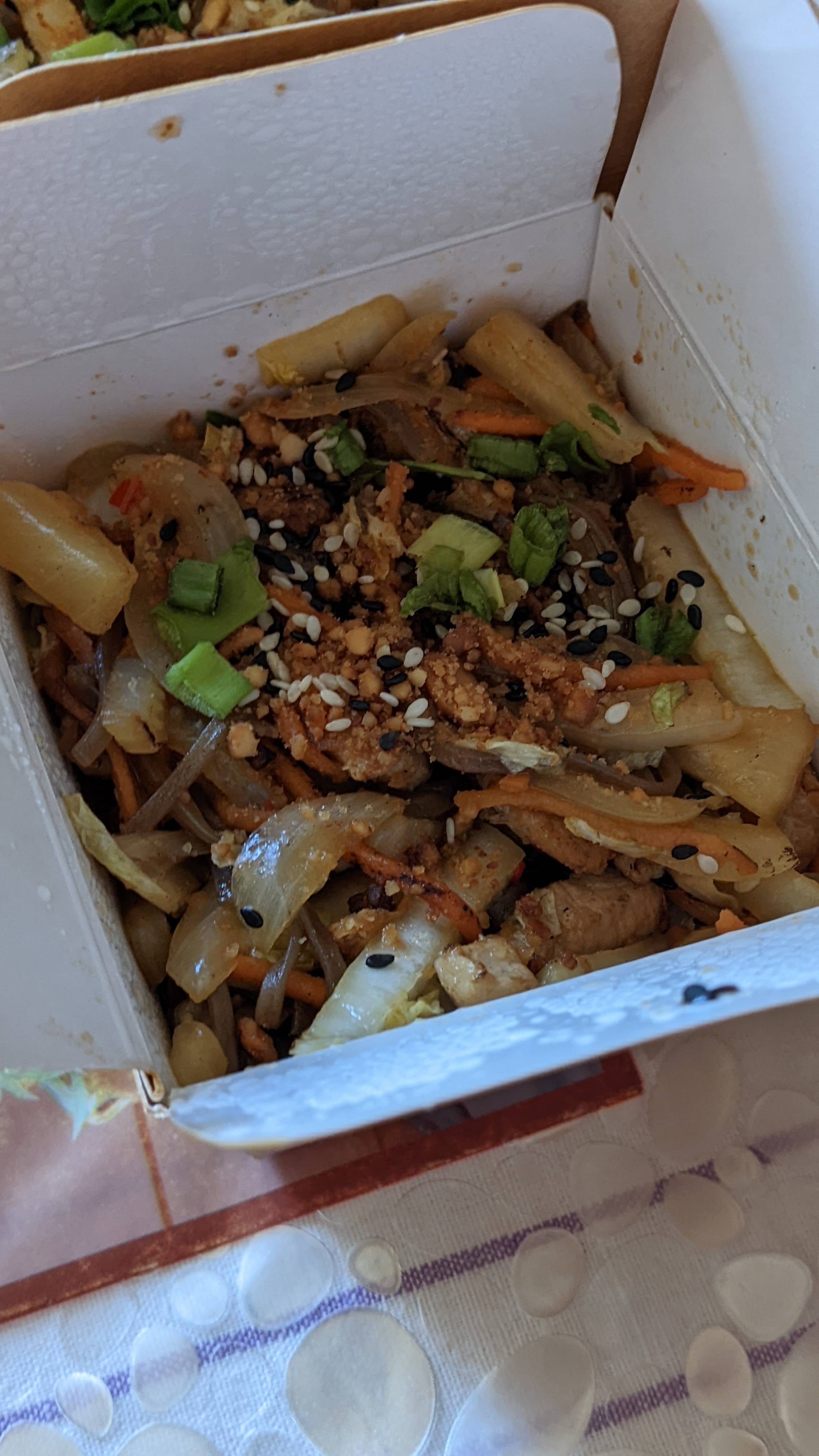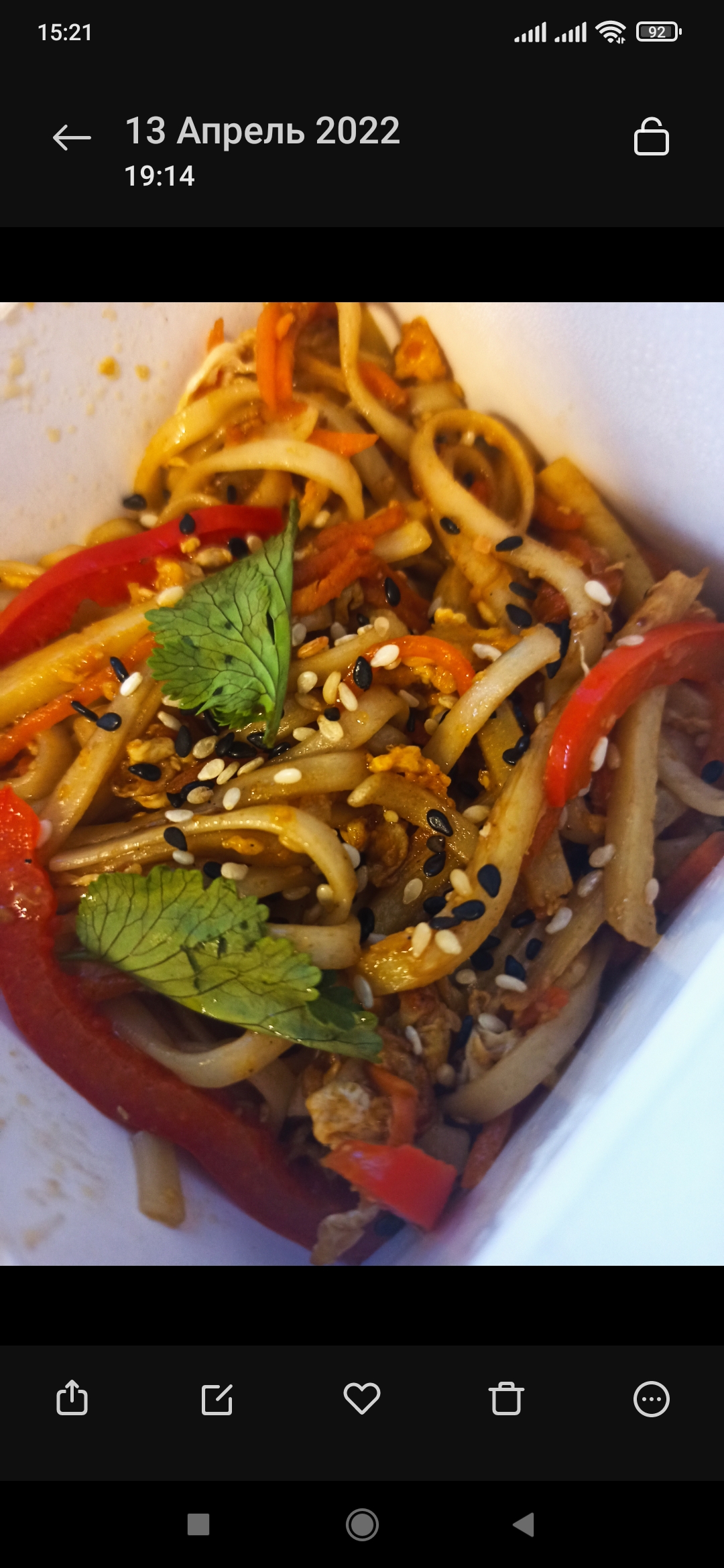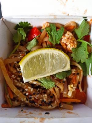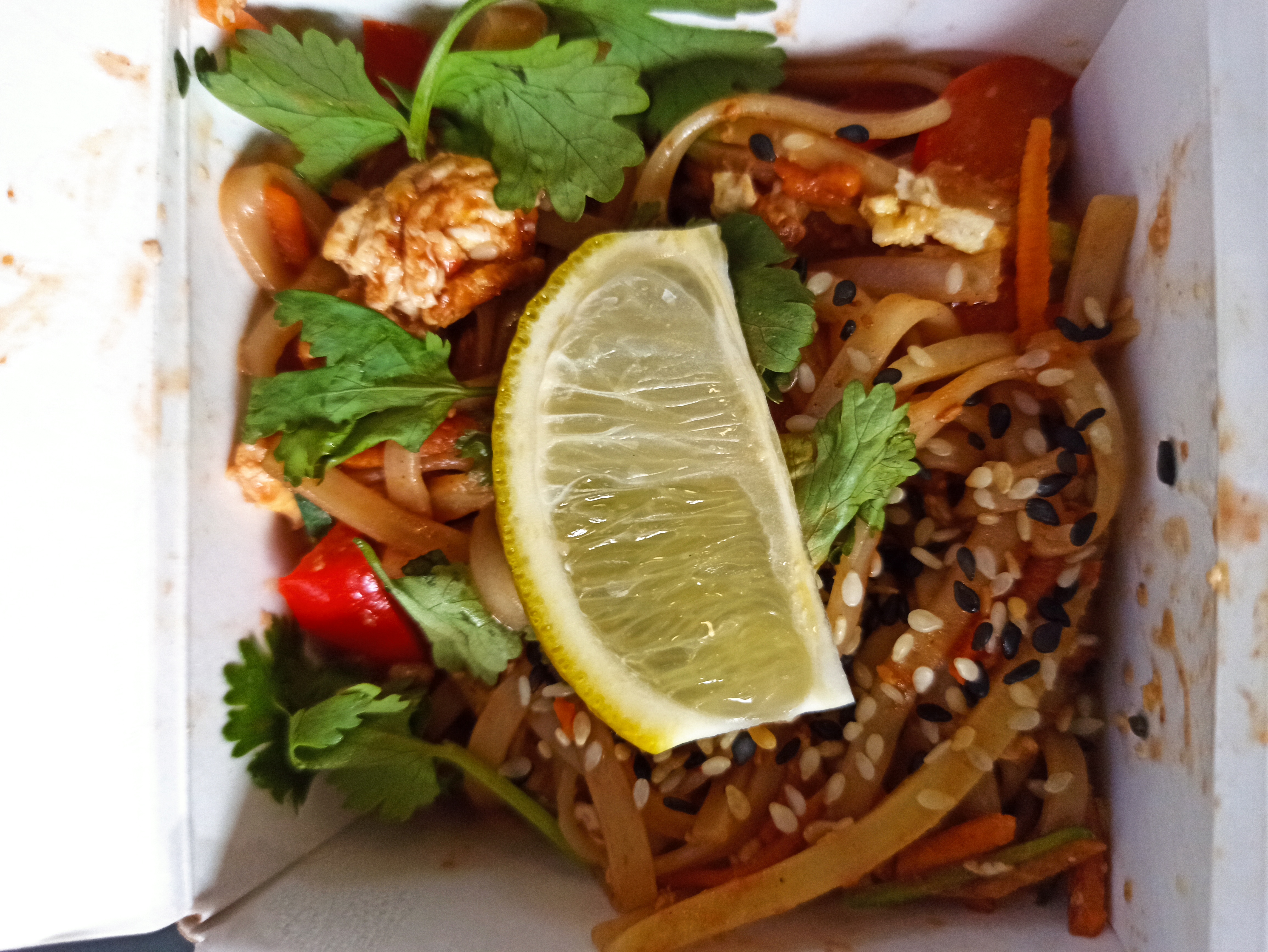 Состав: рисовая лапша с курицей, луком, морковью, лаймом, яйцом, ростками маша, кунжутом, креветочным маслом и обжаренным арахисом в соусе пад тай