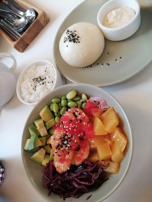 Состав: жареный рис с овощами, свинина в соусе качуджан, желток, салат ромен, кунжут, чили перец, зеленый лук