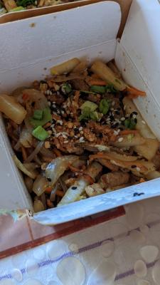 Состав: стеклянная (бобовая) лапша с говядиной, ростки маша, морковь, перец, зеленый лук, кунжут, ореховый соус