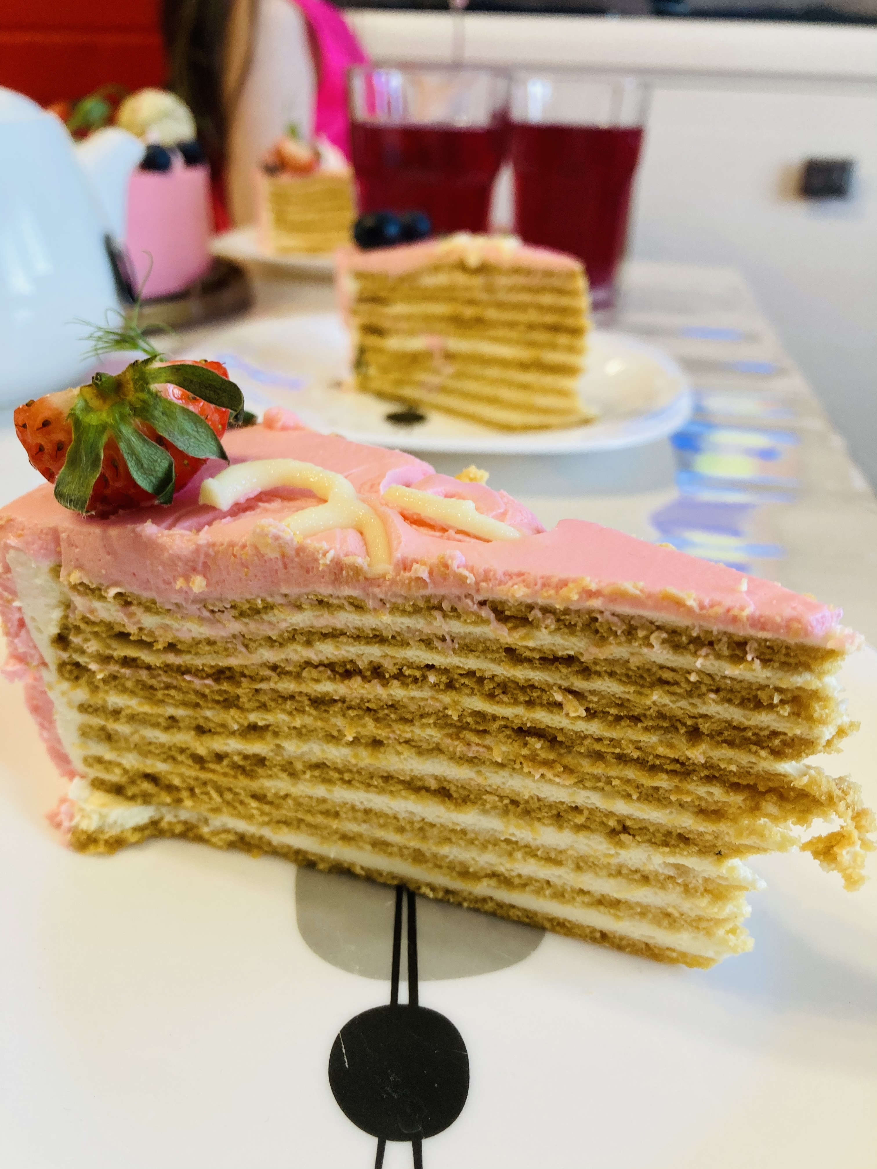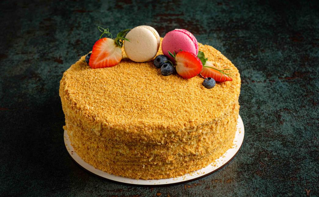 Медовые коржи, приготовленные на основе медовой карамели, пропитаны сметанным кремом.
