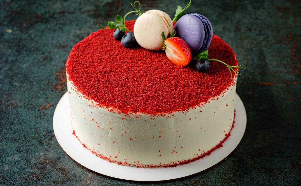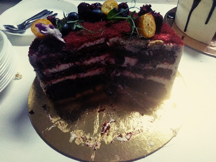 Состав: мука, сахар, сода, какао, яйца, кефир, растительное масло, краситель красный, соль, вишня, бренди, кремчиз, сливки 33%, сахар.