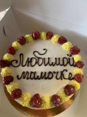 Состав: мука, сахар, сода, яйца, кефир, масло растительное, соль, кремчиз, творог 5%, сливки 33%, сахарная пудра, свежая малина.