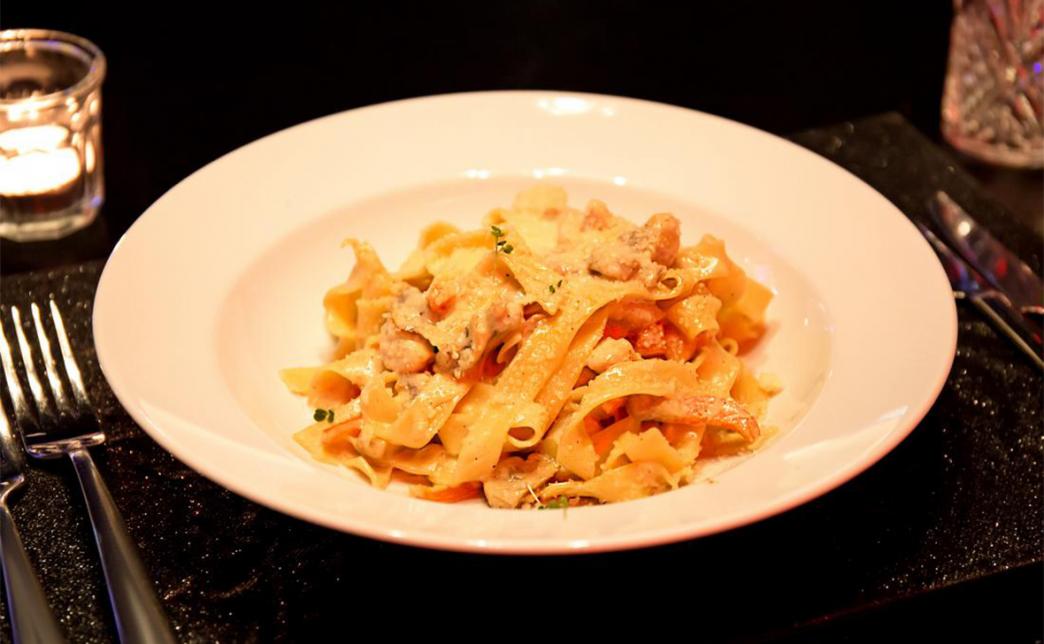 Состав: фетучини, сливки, перец сладкий, шампиньоны, куриное филе, сливочное масло, пармезан