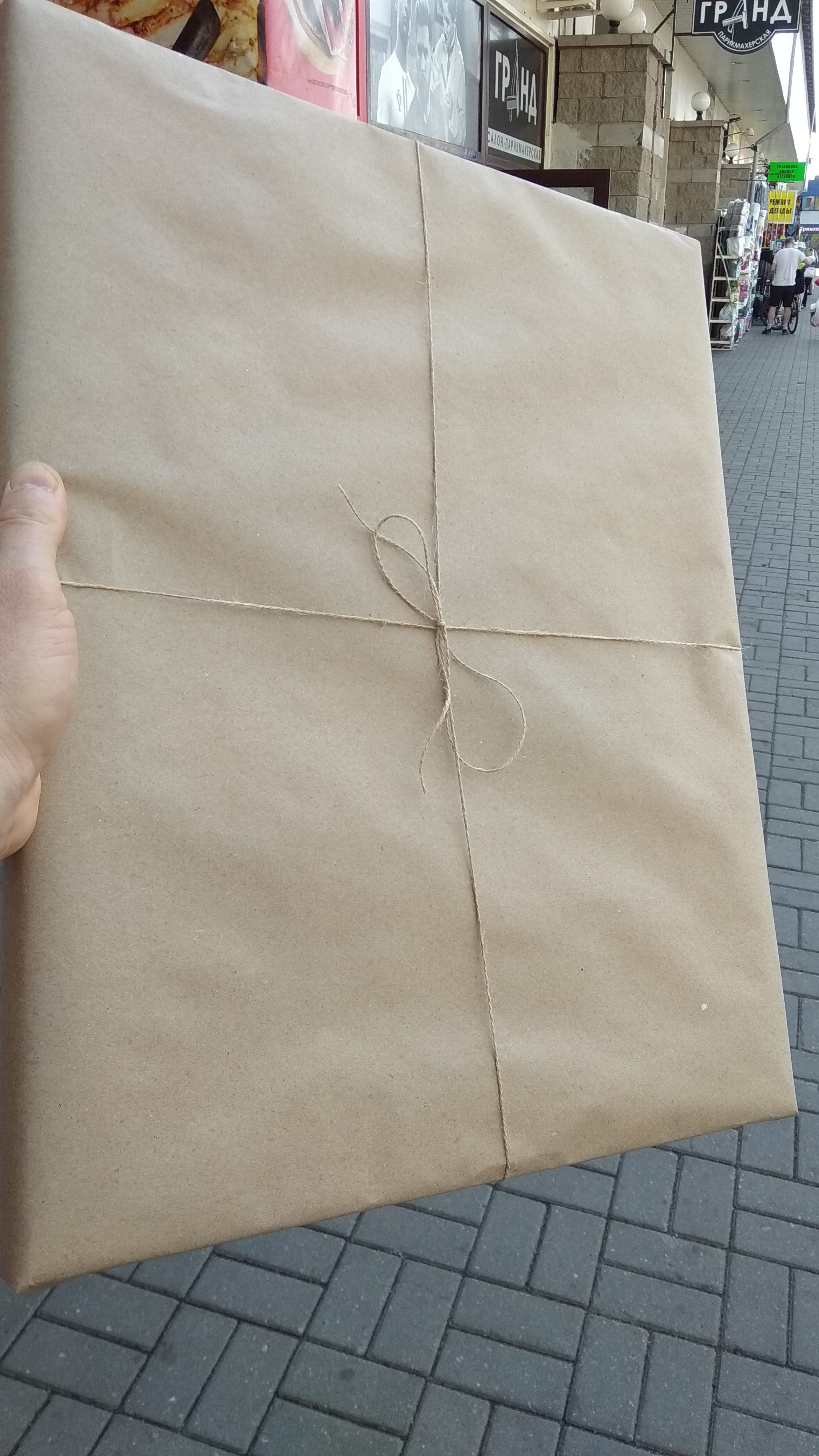 В-третьих, 5 рублей это смешная цена за упаковку, так как обычная цена за упаковку картины такого размера в стандартную «цветную» бумагу стоила бы Вам рублей 10-15.