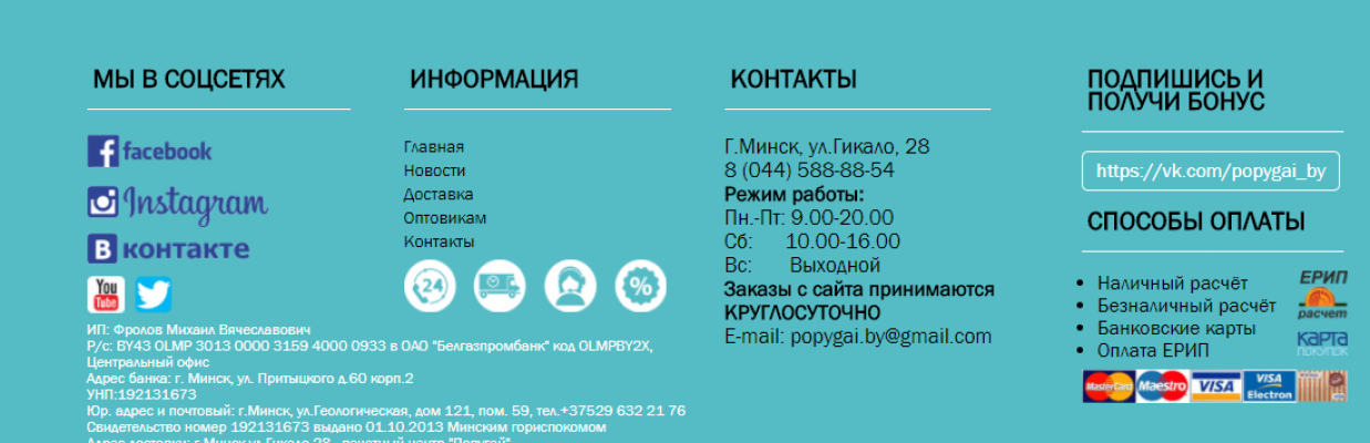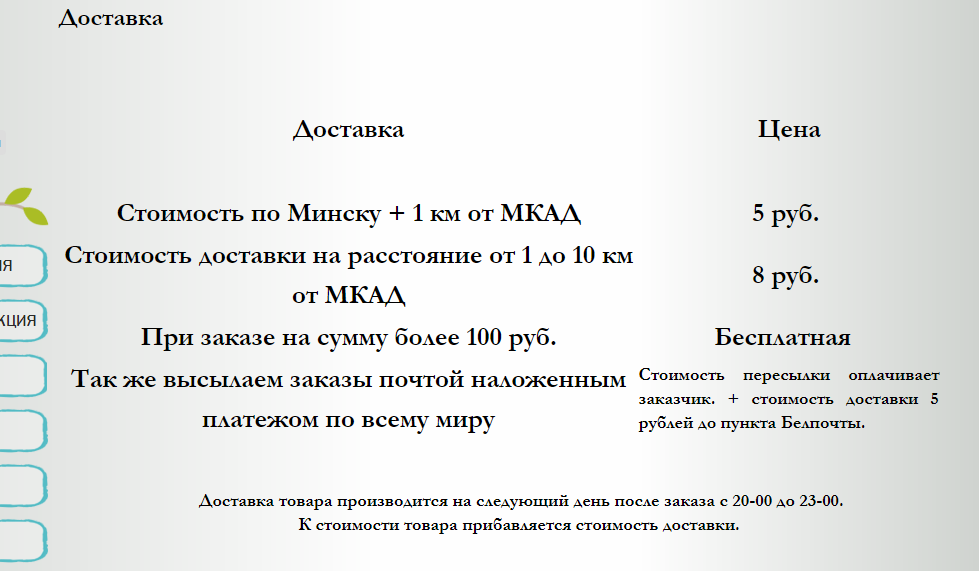 - стоимость доставки по г. Минску - 9 руб. на следующий день после выполнения заказа с 20:00 до 23:00