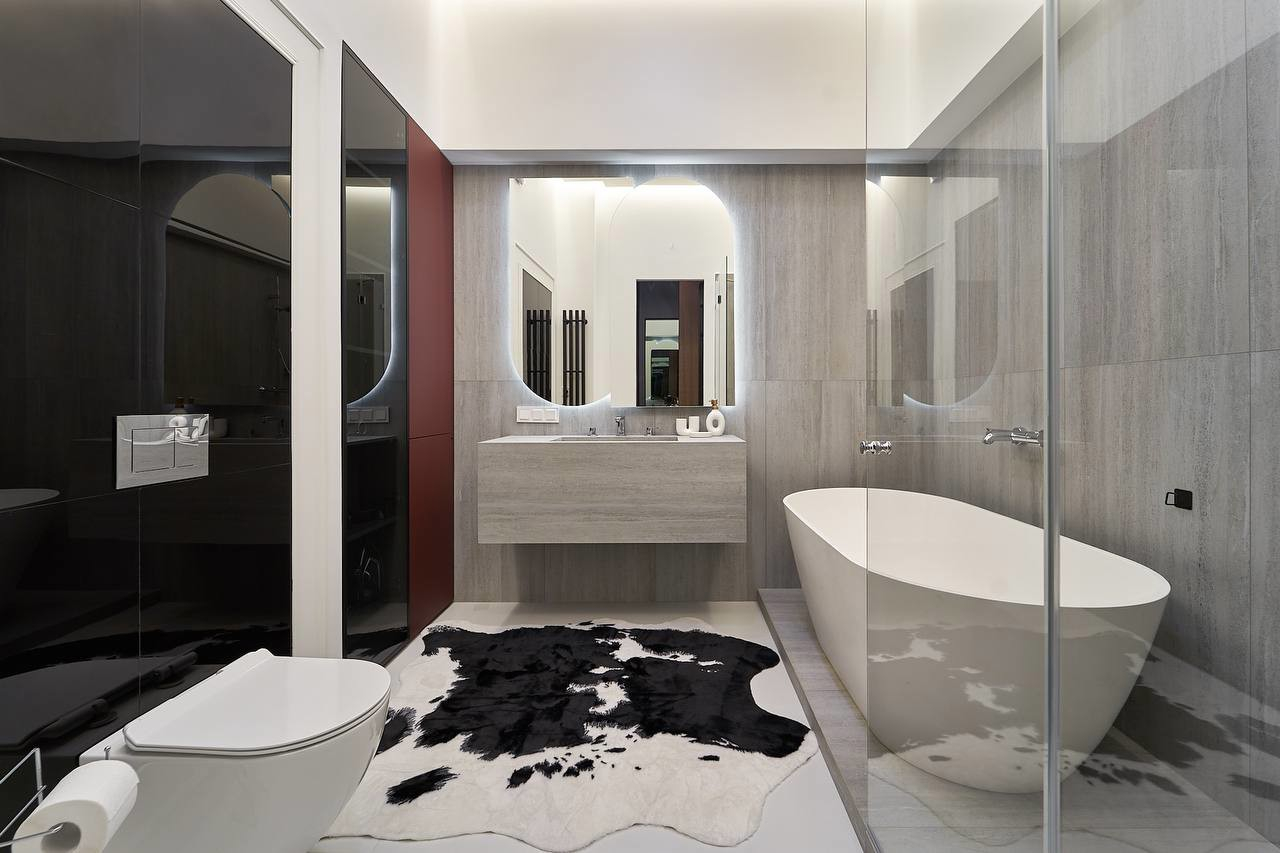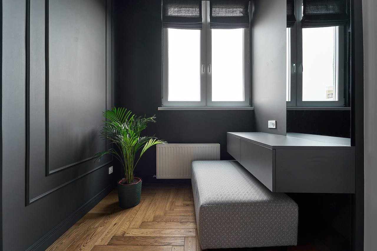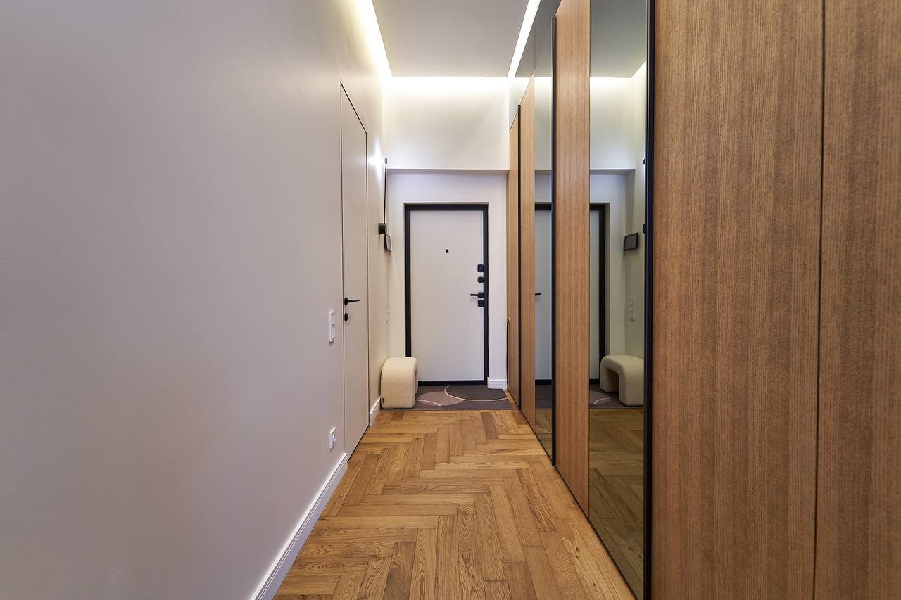 • Спальня-убежище: Зеркальный шкаф в темном графите, скрывающий множество продуманных систем хранения. Просыпаться здесь — уже удовольствие.