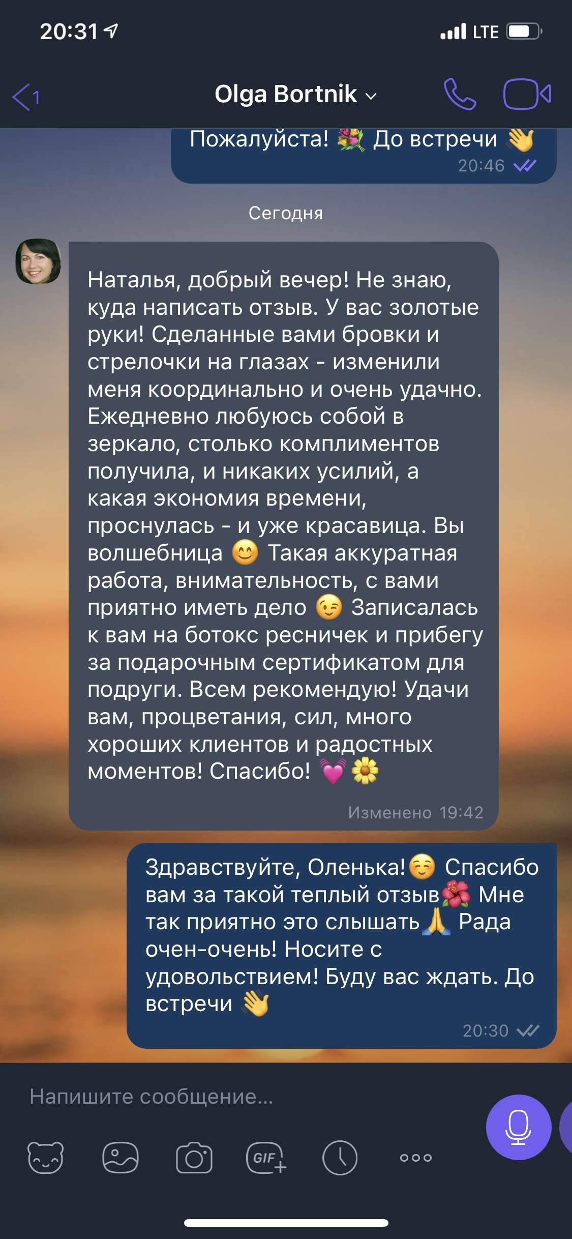С марта этого года знакома с Натальей. Изначально делала межресничку, но мне показалось маловато выразительности глазам,посоветовавшись с Натальей мы через месяц добавили к коррекции межреснички ещё и растушевку. После коррекции растушевку я продолжала ходить на моделированиеи окрашивание бровей. Но в сентябре решилась на пудровое напыление и не ошиблась в выборе мастера. Профессиональный взгляд на форму и грамотно подобран цвет. Я результатом осталась довольна. Все знакомые говорят что бровки получились ВЫСШИМИ. Наталья благодарю вас за ваш труд и профессионализм. У вас в салоне настолько комфортно с нежной не напрягающей музыкой,что засыпаешь во время процедуры.Я на столько сложно переношу боль, что боялась этих манипуляций,но ваши препараты и ваше терпение работают на 1000%. Благодарю за красоту которую вы дарите женщинам. Здоровья вашим рукам!Процветания вашему бизнесу!