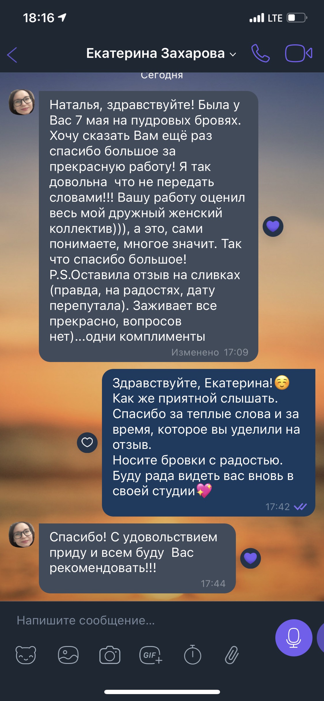 Сегодня  делала обновление перманента (брови) у Натальи. До этого делала год назад. Хочу отметить, что квалификация мастера ОЧЕНЬ! выросла за это время. Очень внимательный, отзывчивый, доброжелательный мастер. Всем рекомендую 100% .