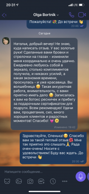 Была у Натальи несколько раз - сперва пришла решать вопрос с бровями, а затем ещё и межресничку с растушёвкой делала. Я очень довольна и отношением мастера, и его работой. Понравилось ещё и то, что Наташа делает свою работу без слепого следования пожеланиям клиента. Поясню. Запрос может быть какой угодно, но поверьте, клиент не всегда видит, как будет лучше. Я прислушалась ко мнению Наташи и готова признать: ее вариант цвета и формы действительно лучше и интереснее, чем мой, с которым я пришла. Ещё один немаловажный плюс - анестетик. Никогда не думала, что на процедуре настолько расслаблюсь, что усну) Наташа, спасибо Вам за Ваши руки и мастерство!)