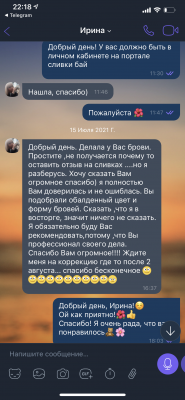 Здравствуйте! Хотела выразить слова благодарности за хорошую работу. Делала пудровые бровки. Результат на лицо) Мою ошибку сделанную много лет назад и исход несимметричные брови исправили на ура🥰 Ну и конечно забыла о утреннем «нарисованием» новых))) Спасибо огромное🙏