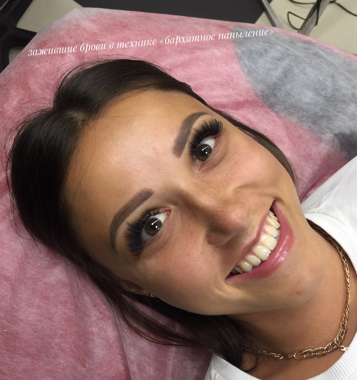 Бархатное, теневое, перманентное, точечное, пиксельное, пудровое, нанотехника - все это синонимы одного способа. Называется он напыление. Напыление - это один из видов татуажа бровей. Выполняется эта процедура с помощью специальной машинки, которая распыляет жидкий пигмент. Если приблизить кожу, то Вы увидите много мелких точек и поймете, почему техника имеет такое название.