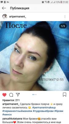 За свои 37 лет брови я делала раз 15 (вместе с коррекциями), у разных мастеров.Но именно у этого мастера цвет получился бровей естественным и форма получились очень элегантная    хотя была непростая задача - перекрытие "старых бровей интенсивного разноцветного тона (за всю мою бровно-татуажную  историю были намешаны пигменты разных цветов и производителей"). Браво! Фото (я без косметики) - зажившие брови, без коррекции. Пигменты - отличные! Работа выполнена супер-профессионально! Рекомендую!
