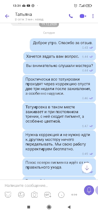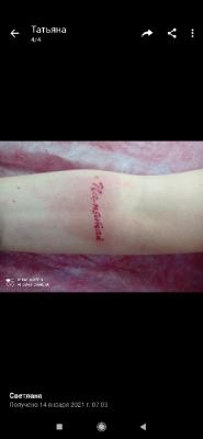Добрый день. Спасибо за оставленный отзыв. Первая татуировка для девушки 16 лет. Была в нашей студии с мамой. Всё вместе выбрали шрифт для надписи. Работа была сделана, результат впечатлил нашу юную леди и маму. Владимир чётко объяснил про уход за тату, пригласил после заживления на бесплатную коррекцию, рассказал про усваиваемость цветных пигментов, мама и юная леди вроде, как услышали всё, но получается не всё. На коррекцию мы не дождались, на связь наша клиентка не выходит и в добавок мы получаем негативный отзыв. Уважаемые наши дорогие клиенты настоящие и будущие, только тесное взаимодействие между мастером и вами принесёт вам результат и не ударит по нашей репутации! Мы работаем с душой и заботимся о каждом из вас и не хотим портить свою репутацию. Всё можно урегулировать, если доверять друг другу. С уважением к каждому из вас студия тату и перманентного макияжа у Соколовских. Всем мира и добра!