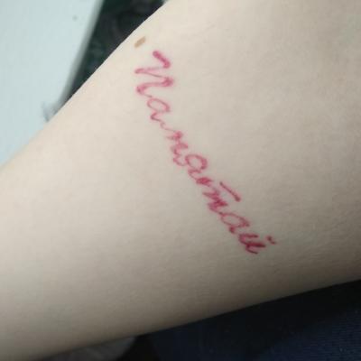 Делала тату у Владимира 4 недели назад. Хотела, чтобы она была красной, в итоге она получилась малиновой. Так как это моя первая тату, я думала что она заживает и станет красной, но увы. У буквы й есть лишняя полоса которой быть не должно, а в П наоборот не полностью закрашена буква.(на фото это всё вроде видно).Придётся идти переделывать к другому мастеру