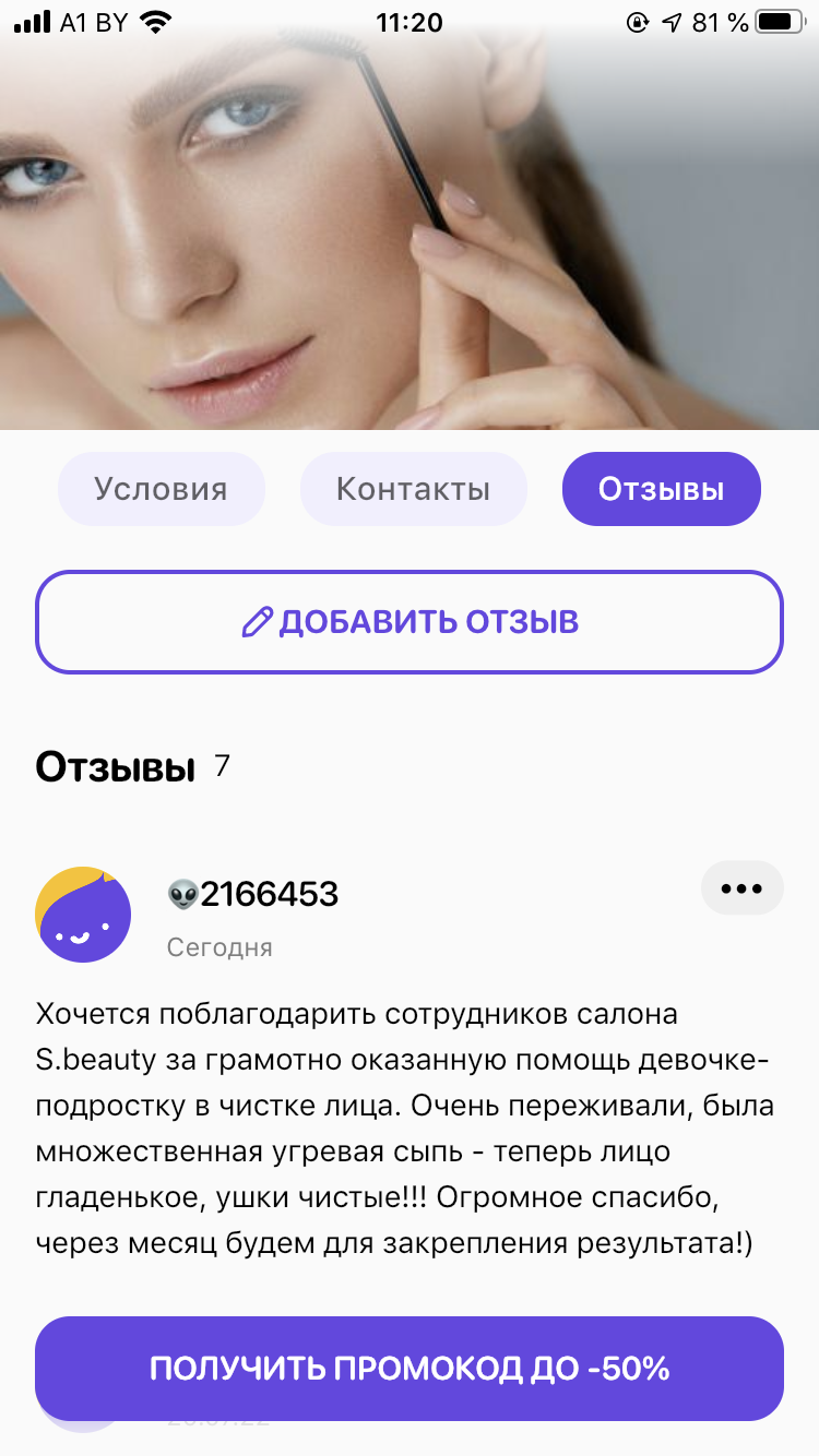 - Промокод дает право на скидку до 50% на пилинги, чистки, уход за лицом, прокол ушей в кабинете эстетики "S.BEAUTY"